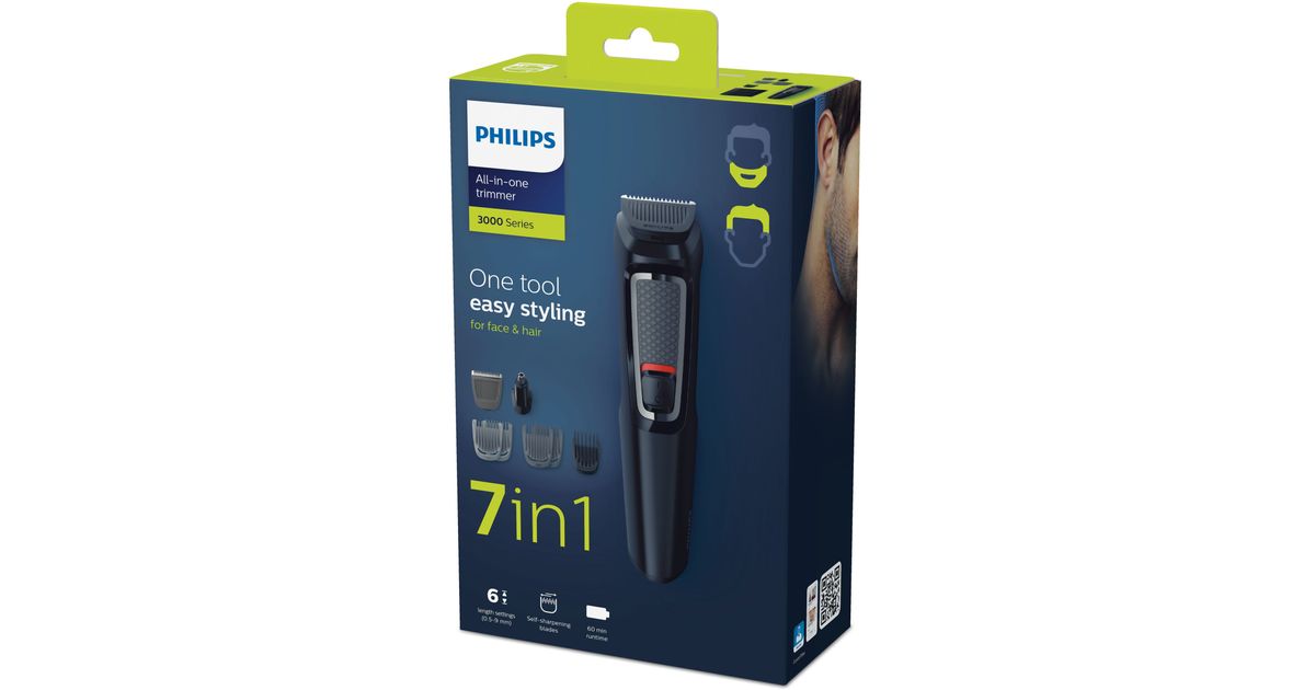 Philips MULTIGROOM Series 3000 7-in-1, Face and Hair MG3720/15, Black, Rectangle, Beard, Ear, Eyebrow, Moustache, Nose, Stainless steel, Battery, 60 min