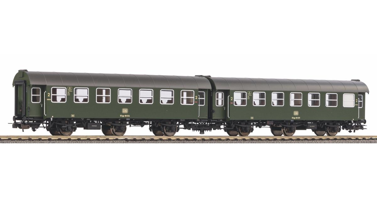 Novelty 2023: Set of two DB short-coupled conversion cars with two 2nd class cars in Era IV. Unlike the prototype, the PIKO models of the three-axle conversion coaches do not use existing parts, but an expert model was completely redesigned. The scaled vehicles reproduce the original exactly down to the smallest detail. Individually attached handle bars are just as much a part of the contemporary design as flush-fitting, crystal-clear windows and detailed interior furnishings. The loving design is also continued on the car floor. It convinces with free-standing lines, a filigree brake linkage as well as shunting handles and metal catch irons. Just like the prototype, the PIKO conversion cars are sold as close-coupled pairs and, thanks to the precisely guided close-coupling kinematics, have a prototypical distance between the cars. The cars are rounded off by the optionally available interior lighting.