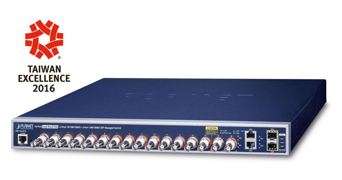 PLANET LRP-1622CS, a brand-new Multi-channel Long Reach PoE Switch, features an extended Ethernet and PoE networking of up to 1 kilometer over the existing coaxial cables going to multiple PoE compliant devices. It provides IPv6/IPv4 dual stack management and built-in L2/L4 Gigabit Switching engine along with 16 BNC ports with Long Reach PoE Injector function, 2 Gigabit copper ports and 2 extra 100/1000BASE-X SFP fiber slots. Each of the 16 BNC ports provides 36 watts of power with a total power budget of up to 440 watts. As an advanced PoE switch, the LRP-1622CS features intelligent PoE functions to improve the availability of critical applications. It provides a quick, safe and cost-effective PoE network solution to upgrading the existing coaxial cable infrastructure from the analog system to the HD IP surveillance system.