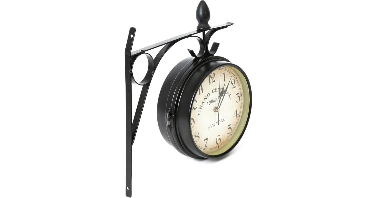 Stylish double-sided wall clock which is designed for both indoor and outdoor use. Made of durable metal and glass.