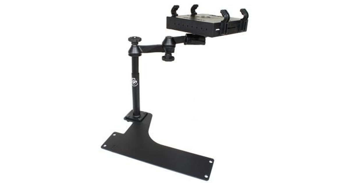 This No-Drill Laptop Stand System installs quickly and easily into the specified vehicles using the existing hardware of the passenger side seat rails. This configuration provides a telescoping feature that ranges from 12 to 18 inches. Dual swing arms provide articulation and 12 inches of reach for passenger and driver access to the mounted device. Patented rubber ball and socket joint provides additional adjustment as well as shock and vibration isolation. The RAM Tough-Tray is spring loaded to accommodate 10" to 16" wide laptops & (17" wide screens) . The tray features four adjustable retaining arms with rubber grip feature. These arms can be moved both vertically and horizontally. This allows for a custom fit for varying thicknesses of laptops and the freedom of not blocking ports or drives. A screen support and USB light are also available to accessorize the tray. Hole patterns on perimeter of tray facilitate the mounting of additional RAM systems to support GPS or other electronics.