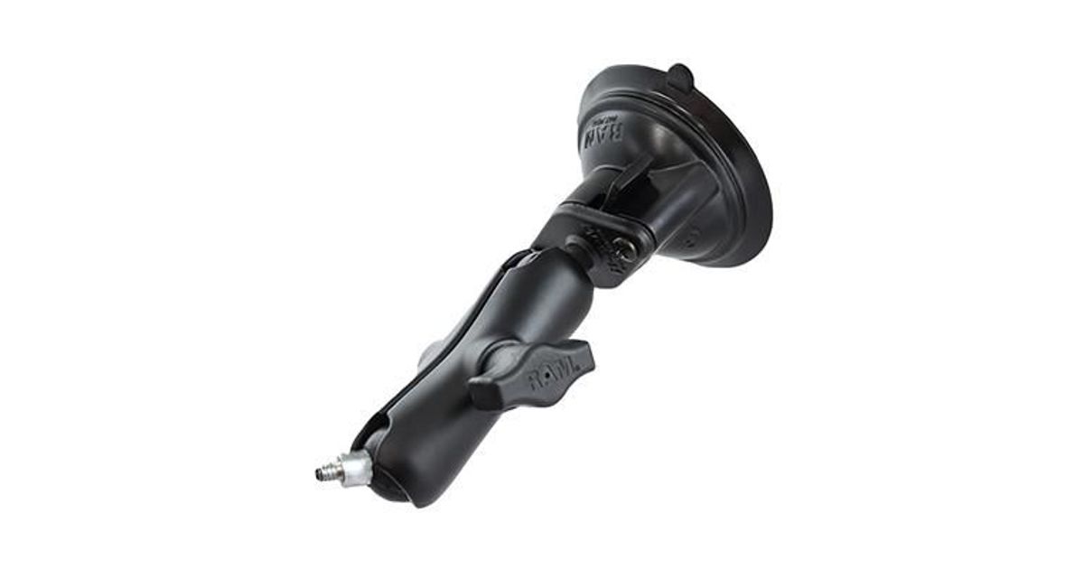 The RAM-B-166-237U consists of a 3.3" suction cup locking base, double socket arm and 1" rubber ball that contains a 1/4"-20 camera male thread. The male thread matches most standard camera and camcorder female threads found on the bottom of the camera. The mount contains adjustment points at both ends of the double socket arm; this allowing for almost infinite adjustment and perfect viewing angles. The suction cup, twist lock base is designed to have a strong hold on glass and non-porous plastic surfaces, including adhesive disks.