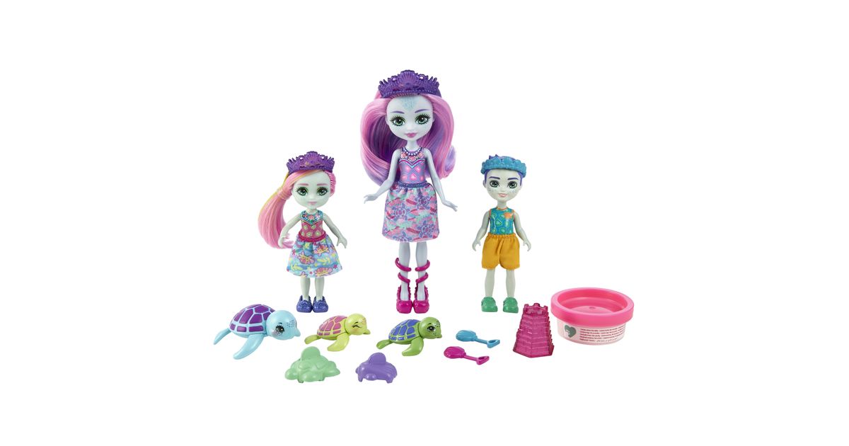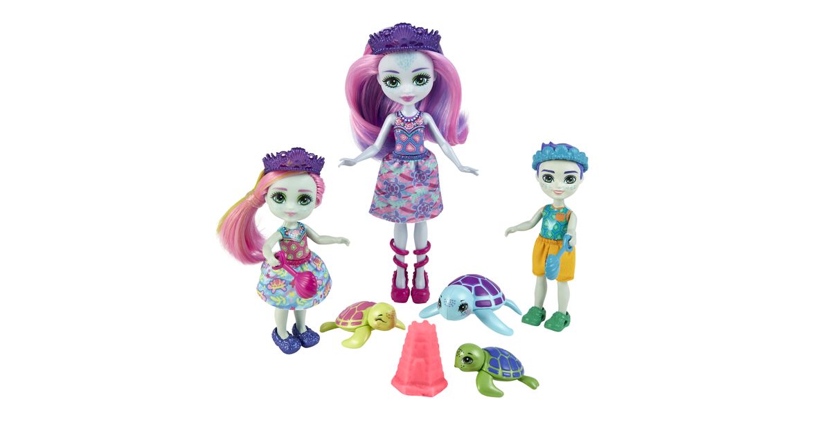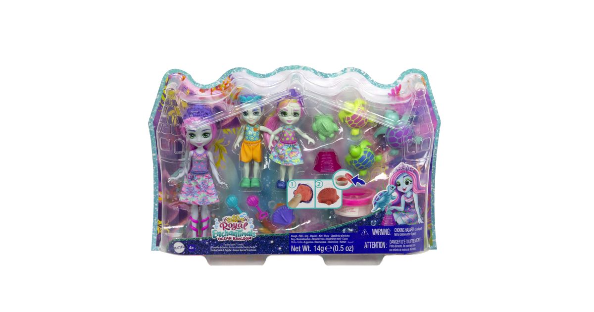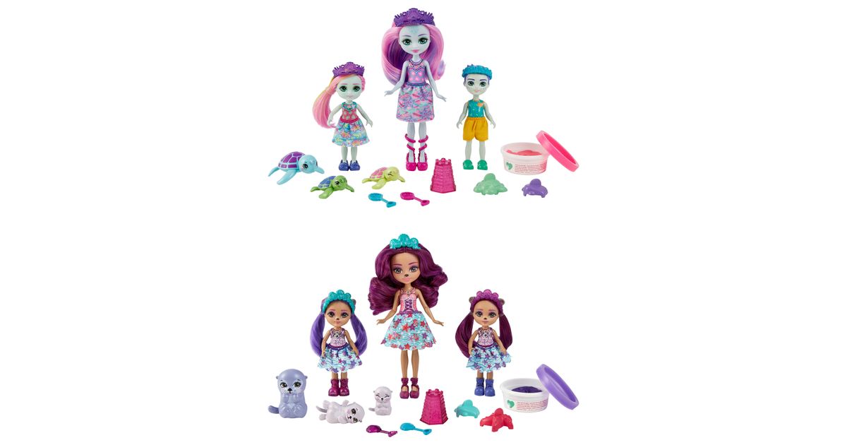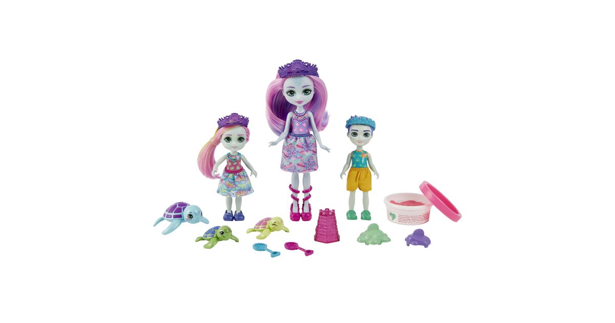 Make a splash with these Enchantimals™ family sets from the Ocean Kingdom™ collection! Each set includes 3 dolls, 3 besties, play dough, and 5 accessories. Choose from Tinsley Turtle™ or Ottavia Otter™ family packs with their little siblings and animal-besties. Use the play dough and molds to build sandcastles and other fun sea shapes! Little ones will love playing out the special Enchantimals™ family bond. And with 6 characters, it's extra fun for your little one! Colors and decorations may vary. Each set sold separately, subject to availability.