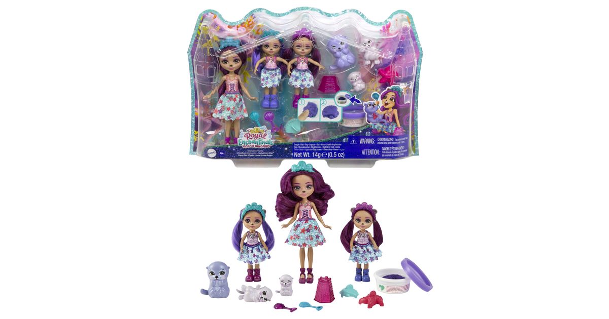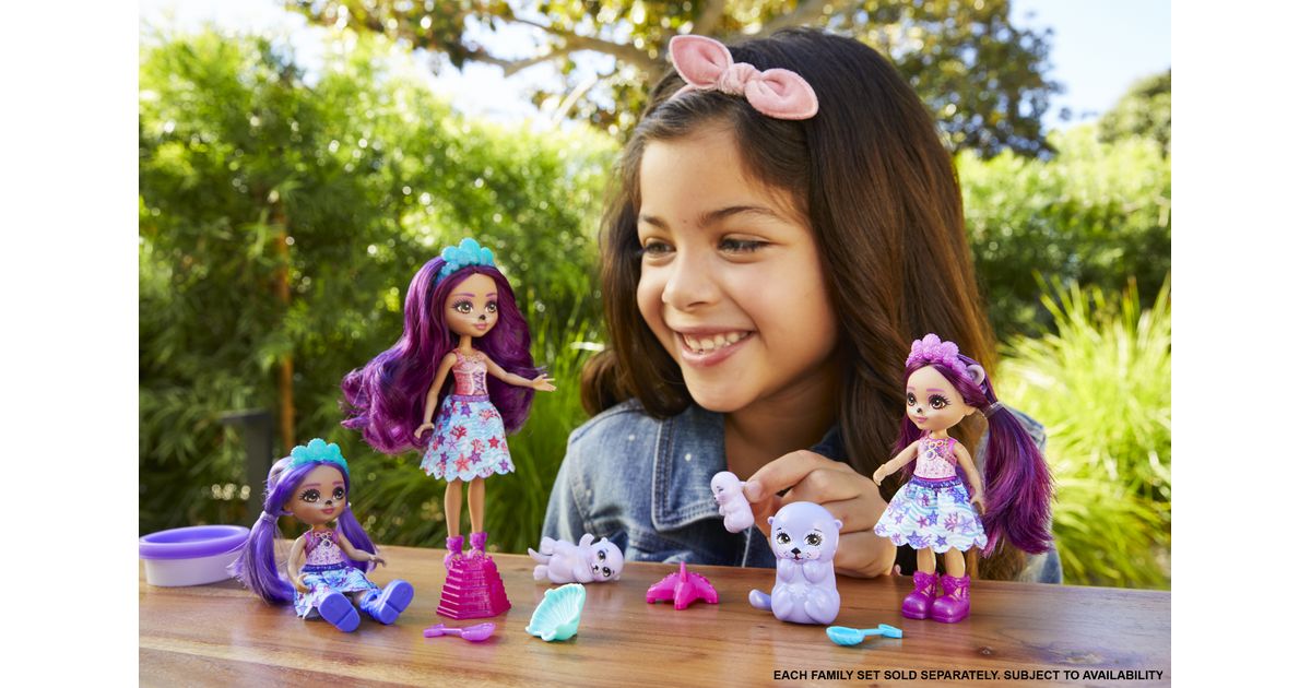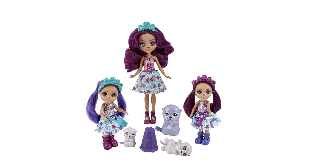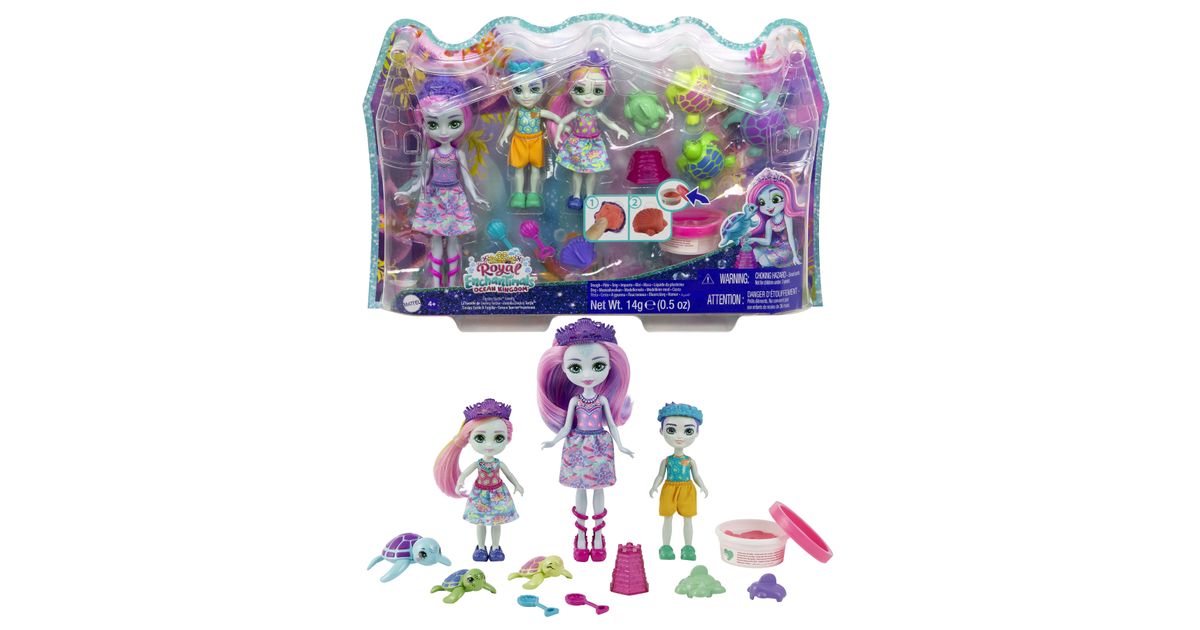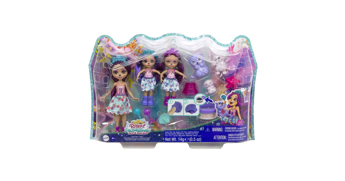 Make a splash with these Enchantimals™ family sets from the Ocean Kingdom™ collection! Each set includes 3 dolls, 3 besties, play dough, and 5 accessories. Choose from Tinsley Turtle™ or Ottavia Otter™ family packs with their little siblings and animal-besties. Use the play dough and molds to build sandcastles and other fun sea shapes! Little ones will love playing out the special Enchantimals™ family bond. And with 6 characters, it's extra fun for your little one! Colors and decorations may vary. Each set sold separately, subject to availability.