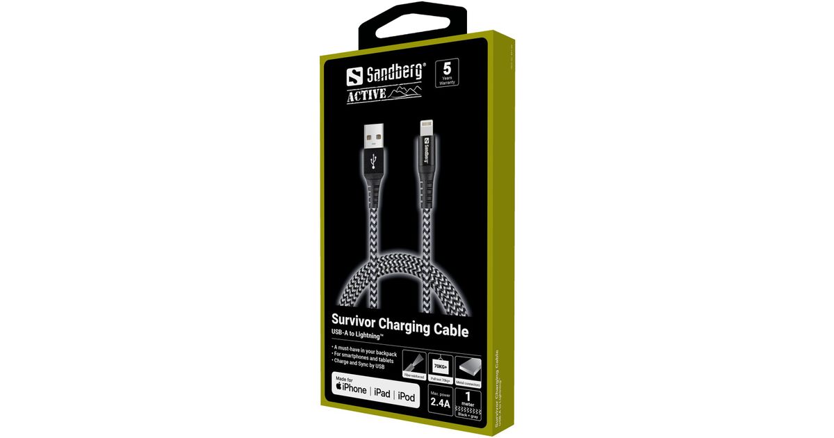 Sandberg Survivor Cable is a charging cable that lasts! The cable is made of super-strong Kevlar in double braided nylon, while the connectors are made of cast metal. The extra strong connections ensure that the plug does not break from the cable. Tested to pull over 70kg and bend over 60,000 times.