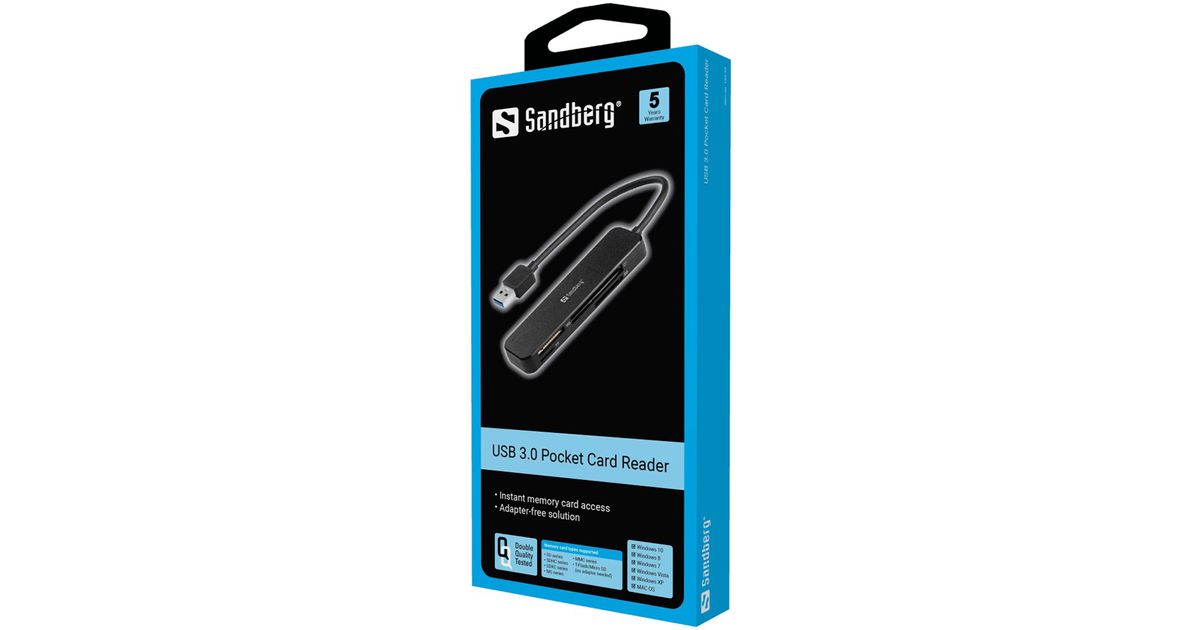 The Sandberg USB 3.0 Pocket Card Reader is the right choice if you want to read and write to several different types of memory card. With the card reader in the USB port you can read and write to a memory card just as you would to a hard disk.