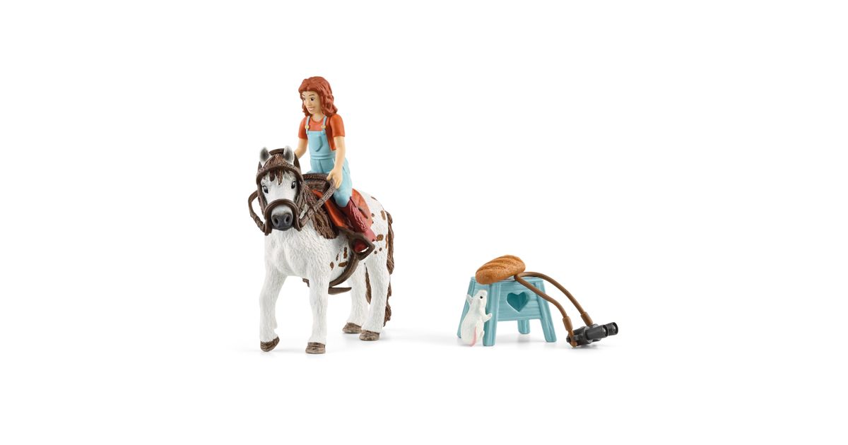 1x girl, 1x Shetland pony mare, 1x saddle, 1x bridle, 1x reins, 1x little mouse, 1x stool, 1x spyglass, 1x bread