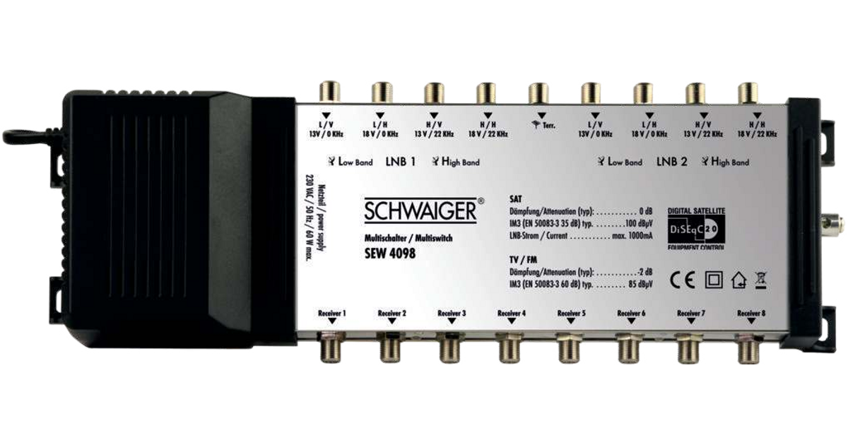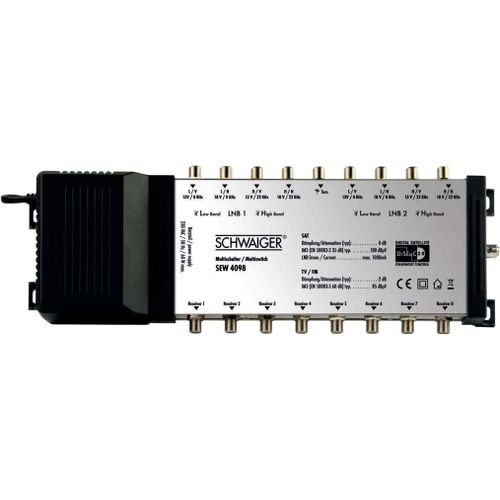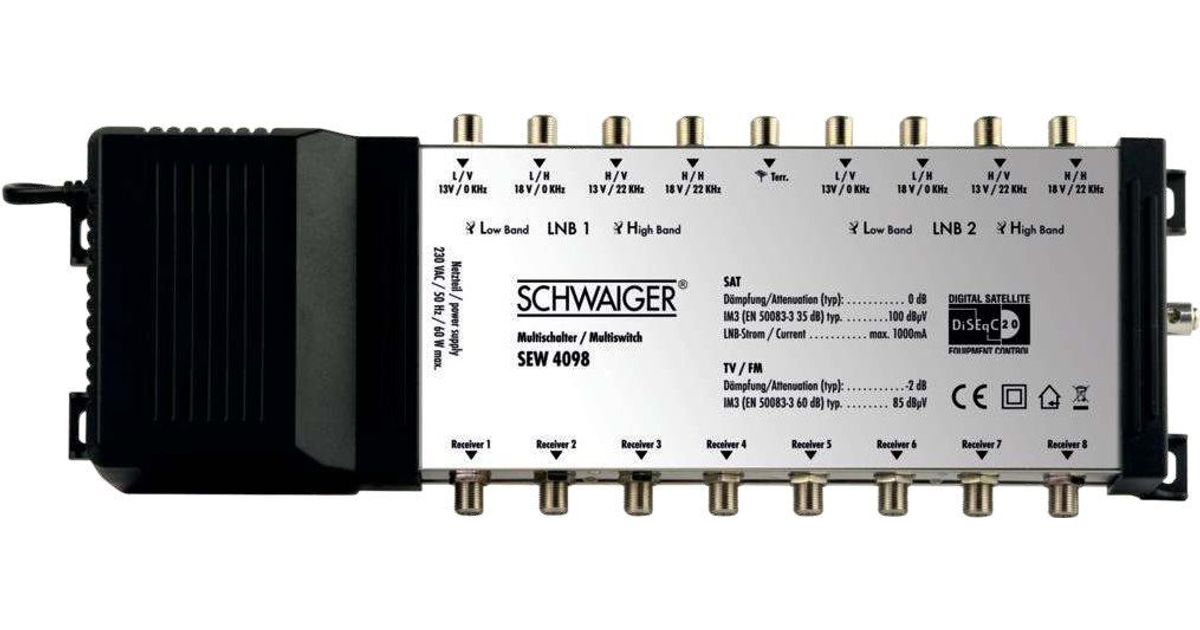 This SCHWAIGER multi switch is used to distribute digital signals of 2 satellite positions to up to 8 subscribers. You can feed 2 Quattro LNBs as well as terrestrial signals. All subscribers can make use of the entire range of programmes independently from one another. A special feature of this multi switch are the differently coloured connections to avoid mix-ups upon installation.