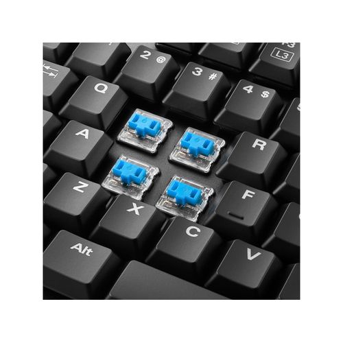 Many writers particularly do not want to miss out on its blue switches. With a distance to actuation point of only 1.5 mm, plus detectable click and switching point, fatigue-free usage with a pleasant typewriter atmosphere is guaranteed. The flat height of the keyboard supports ergonomic use even without a palm rest. Thanks to its long operating life cycle of at least 50 million keystrokes, tens of thousands of pages can be typed – even in darkened surroundings with its continuously adjustable RGB illumination.