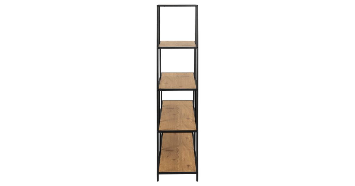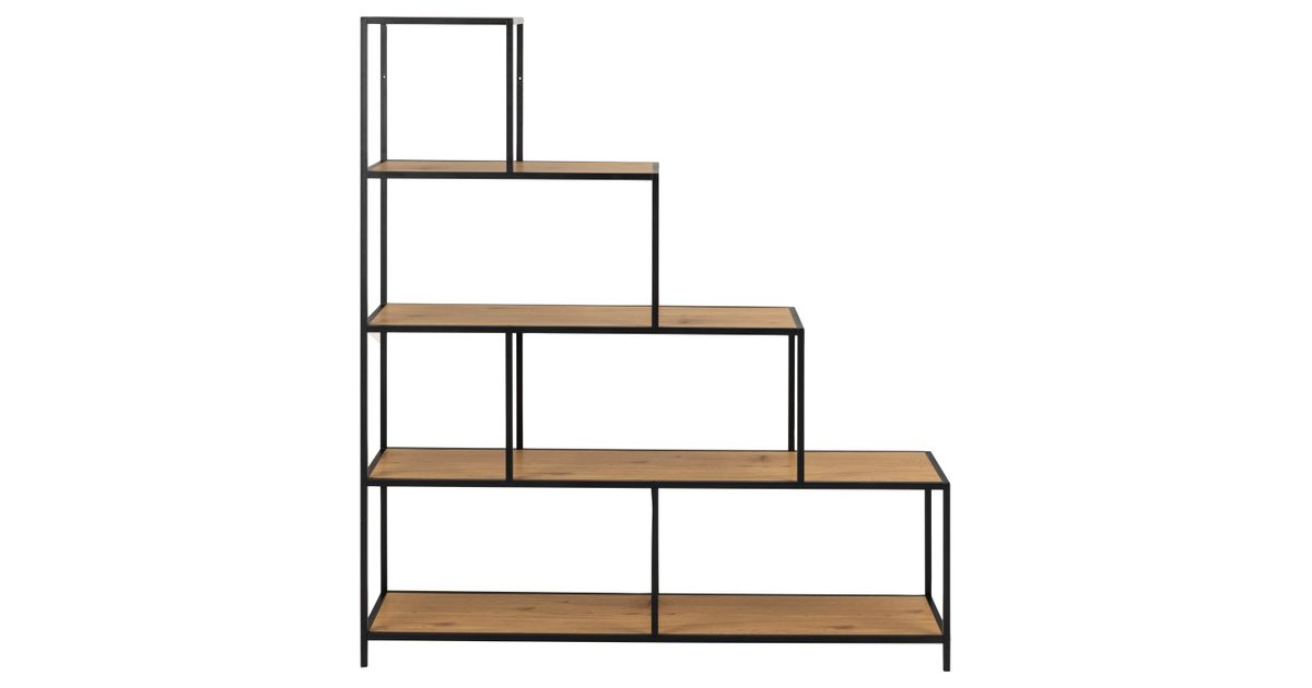 Perfect accent for adding style to a room. The shelf has an asymmetrical design. Material: matt wild oak rough paper. Frame and base: matt black rough powder coated metal. The dimensions are 135x35xH150cm. CARE: Use a cloth firmly wrung in mild soapy water and make sure to wipe dry. Avoid using scouring powder or nylon sponges as these will fade or scratch the material. Do not scuff the surface with hard objects.
