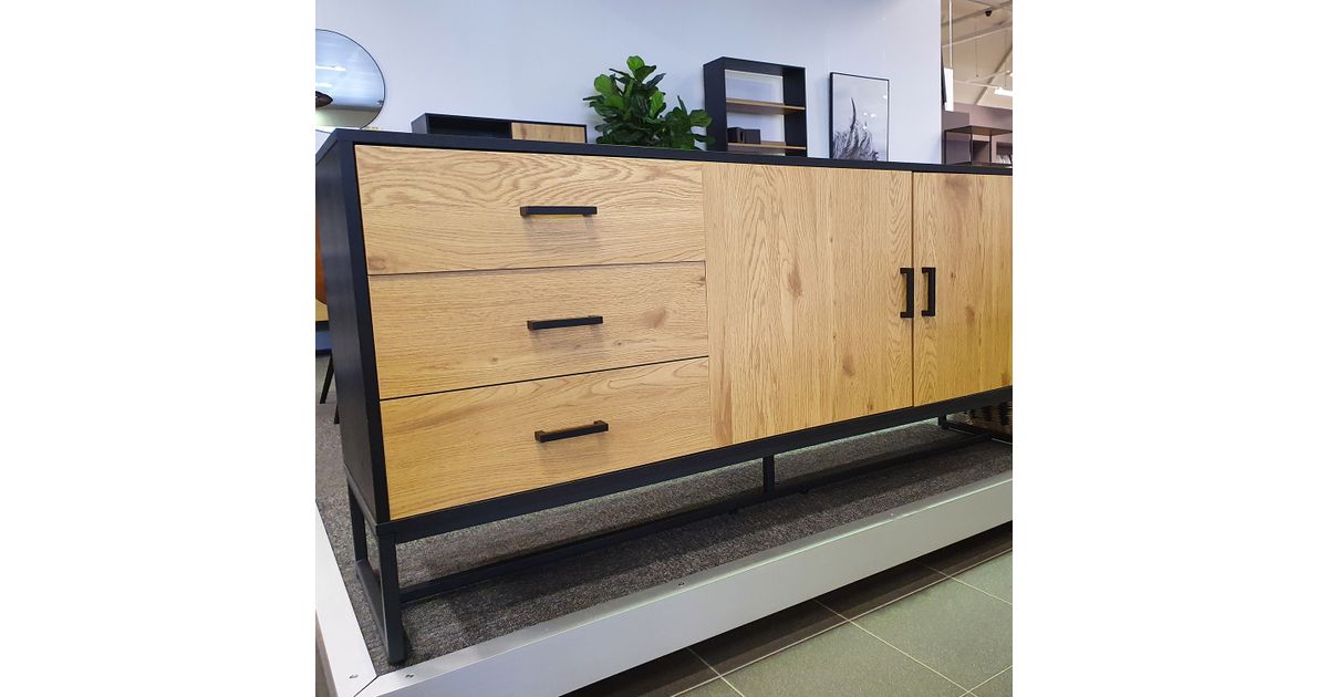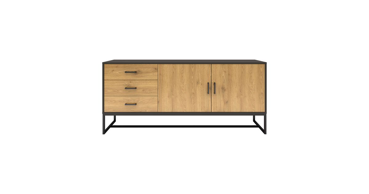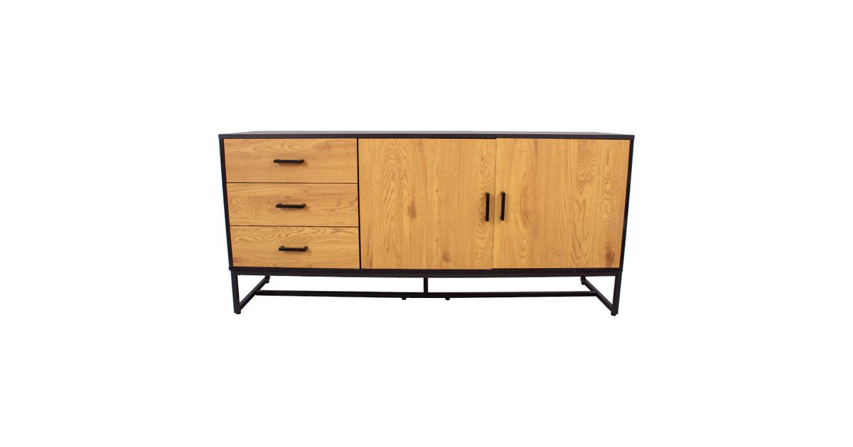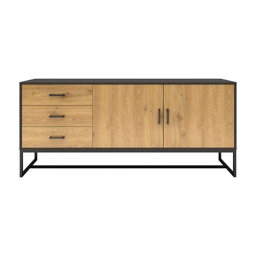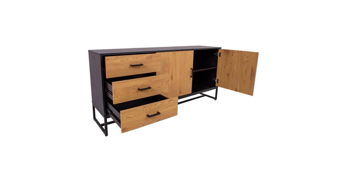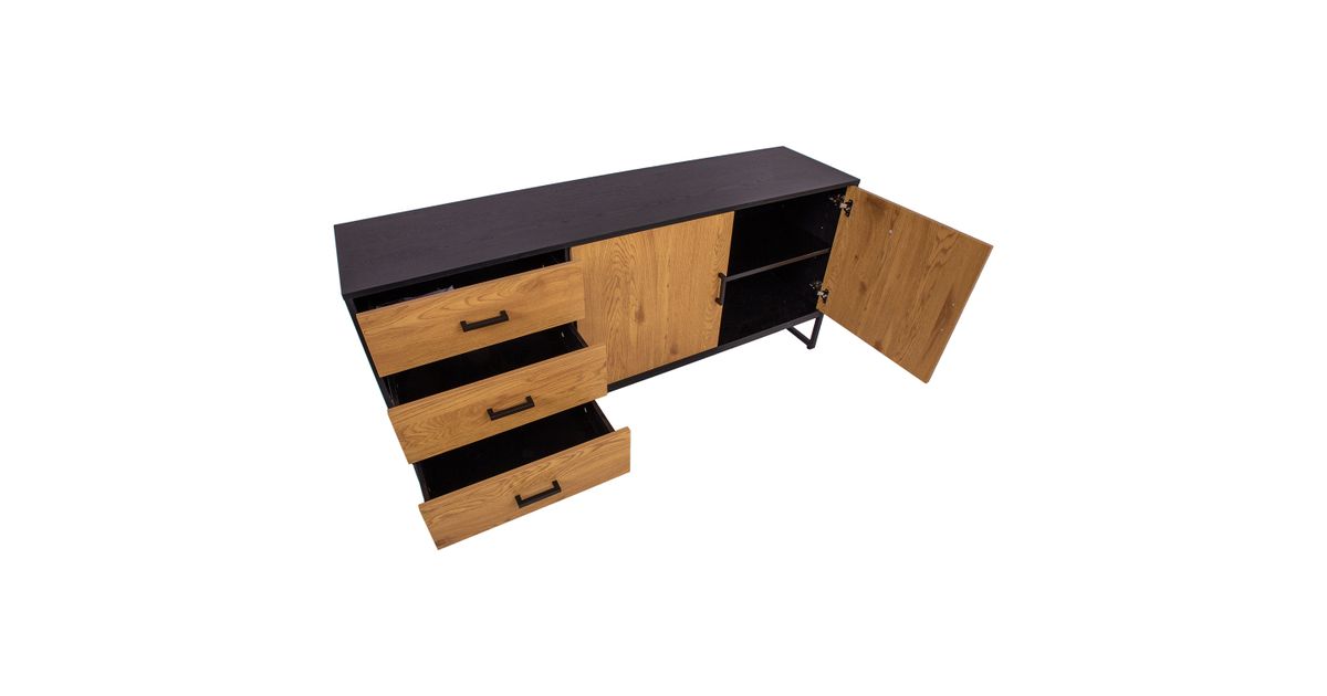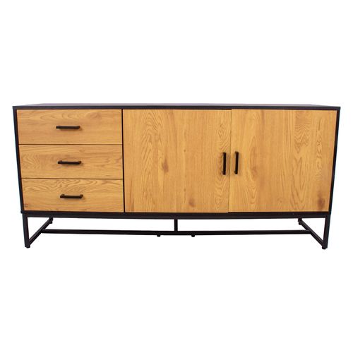 Side board AMSTERDAM 160x40xH75cm. Material: melamine board, color: oak/black. Black metal base frame. Soft closing hinges and drawer glides. Black aluminum handles.