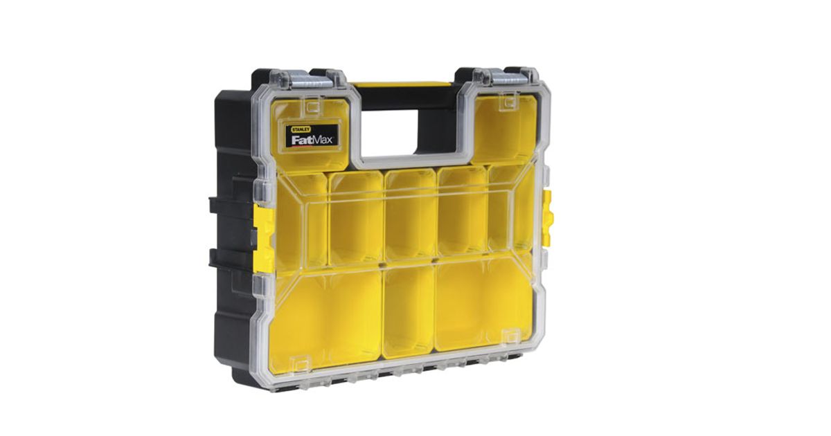 The STANLEY® FATMAX® Deep Professional Organizer has a virtually unbreakable transparent polypropylene lid, held securely in place by strong and durable metal latches, providing clear and un-obstructed visibility of organiser contents, making it easy to find what you’re looking for. Its hinged lid, held securely in place by metal latches, with waterproof seal not only prevents water ingress, but also protects contents from rust, dust and other harmful foreign particles. 10 removable and stackable storage cups for organisation and storage of small parts, components and accessories, which can be used either integrally or stacked together for use outside the organiser. The STANLEY® FATMAX® Deep Professional Organizer incudes 10 removable and stackable storage cups for organisation and storage of small parts, components and accessories, which can be used either integrally or stacked together for use outside the organiser.