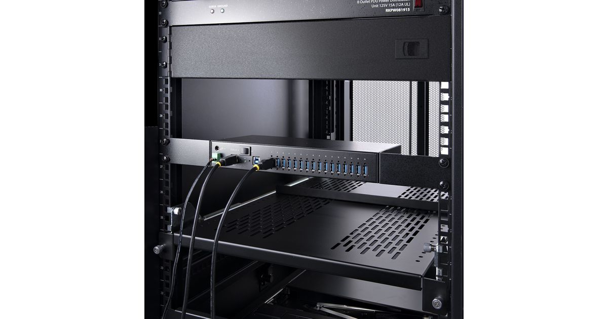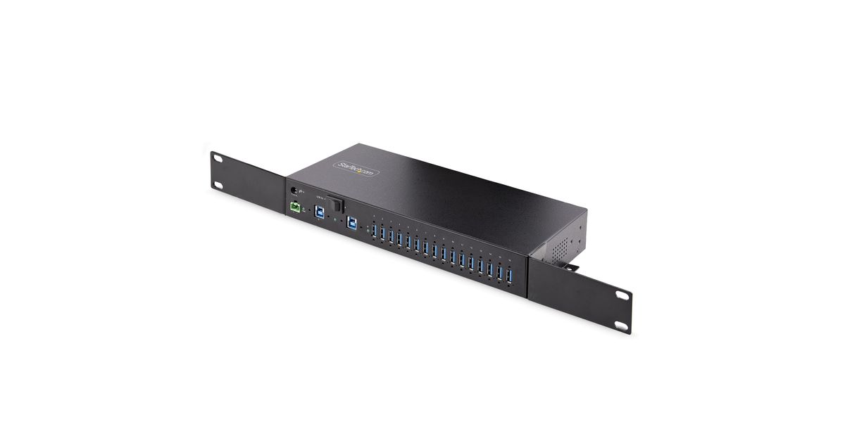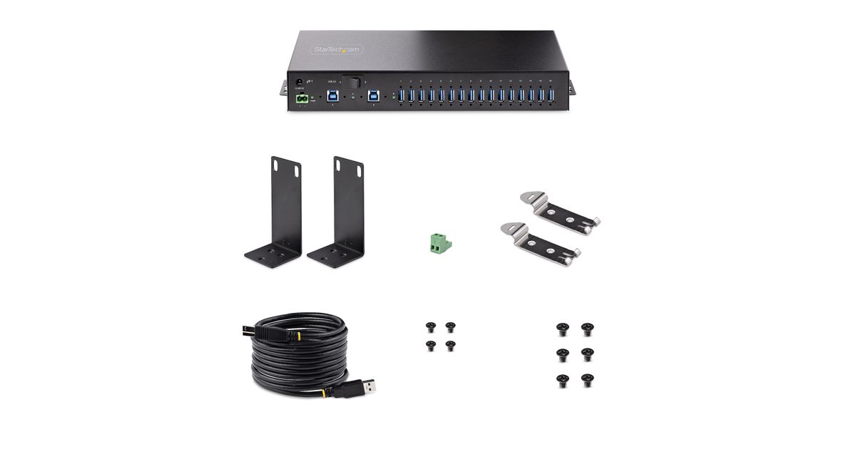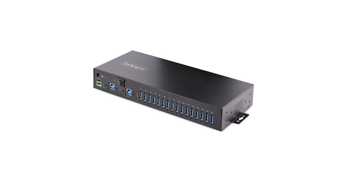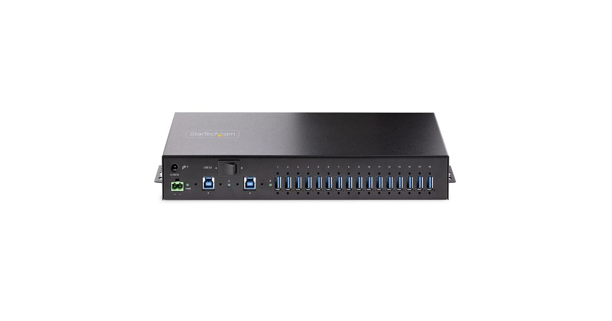 Add 16x USB 3.2 Gen 1 (5 Gbps) ports to two host computers, using this DIN-rail/Surface/Rack-mountable industrial hubThe 16-Port Industrial USB 3.0 Hub with 5Gbps of shared bandwidth provides fast and efficient transfer speeds, making it an ideal solution for data-intensive applications. The hub features a 2-port host switch, enabling users to switch between two host devices, streamlining device management. The hub also includes ESD protection to safeguard against static electricity. Versatile mounting hardware is included for flexible installation options. Additionally, the hub supports USB BC 1.2, enabling fast charging of battery-powered USB devices. The combined features of this USB hub ensure stable and reliable functionality for use in IT and industrial applications.Engineered for Use in Industrial EnvironmentsThis USB hub is built to withstand harsh industrial environments. It features a rugged steel housing that provides protection against physical hazards such as drops and impacts. It is equipped with Level-4 ESD protection, with 15kV air and 8kV contact discharge ratings, to safeguard against damage caused by static electricity. These features make the USB hub an excellent choice for use in factories, production lines, and other industrial settings.Three Mounting OptionsThe 16-Port USB Hub offers three mounting options to accommodate a wide variety of applications, from IT to industrial. The 19" rackmount rails included with the 16-Port USB hub are compliant with EIA-310 standards, ensuring compatibility with standard racks. These rails can be used to install the USB hub into 1U of rack space for applications in data centers and server rooms. The built-in surface mount is perfect for workstations, desks, or walls, where users need quick access to the USB hub. The standard DIN-rail (Top Hat/TH) mounting hardware is best suited for industrial automation and control equipment.Connect and Charge USB DevicesThis USB Hub features two 12-24V DC power options. Power can be inputted using the 2-wire terminal block connector or the barrel connector. Both options enable support for USB Battery Charging Specification 1.2 (BC 1.2) with 120W shared across all ports. Ports are grouped in 8 pairs (1&2, 3&4, 5&6, 7&8, 9&10, 11&12, 13&14, 15&16) and each pair supports max 3.0A/15W combined (1.5A/7.5W per port), or max 2.0A/10W per port when only one of both ports is used.Dual-Host SwitchThe USB Hub can connect to two separate desktop or laptop computers, and features a dual-host switch that enables easy toggling between them. The dual-host switch provides a convenient solution for applications requiring two host devices.Wide Device CompatibilityThis USB Hub is OS independent ensuring compatibility with all operating systems, including Windows, macOS, and Linux.Enhance Productivity and Device Management with the StarTech.com Connectivity Tools ApplicationDeveloped to improve performance and security, StarTech.com Connectivity Tools is the only software suite on the market that is compatible with a wide variety of IT connectivity accessories. This product utilizes the USB Event Monitoring utility. Use this utility to track and log connected USB devices.For more information and to download the StarTech.com Connectivity Tools application, please visit: www.StarTech.com/Connectivity-Tools5G16AINDS-USB-A-HUB is backed by a StarTech.com 2-year warranty and free lifetime 24/5 multi-lingual technical support.The StarTech.com Advantage