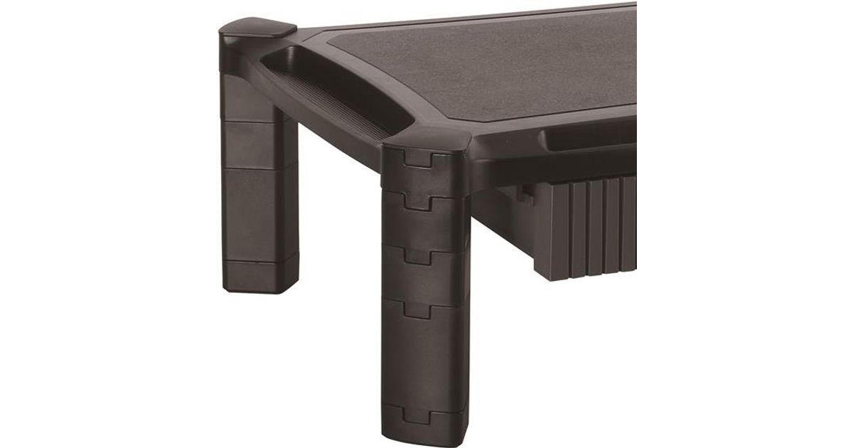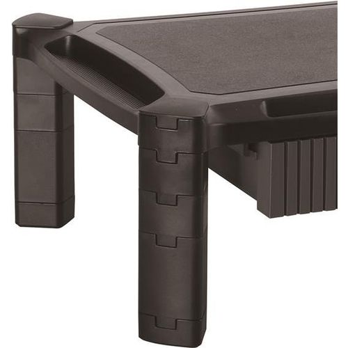 Raise your monitor to eye level for more comfortable viewing, while saving desktop space. This sturdy height-adjustable monitor stand supports a monitor up to 32” in size and up to 22 lb. (10 kg) in weight, and provides a large storage space underneath the riser. It features stackable columns that sit neatly on your desk or table, leaving enough space to fit virtually any laptop. It even has a drawer to hold office supplies.