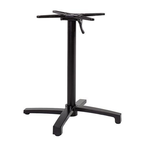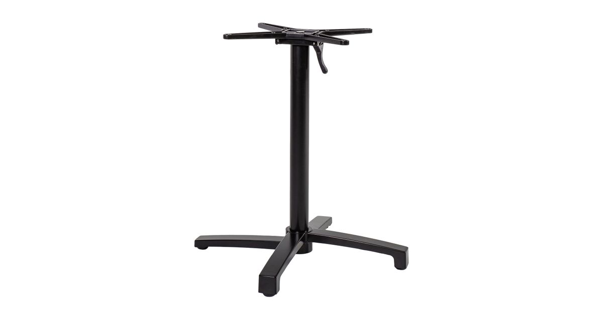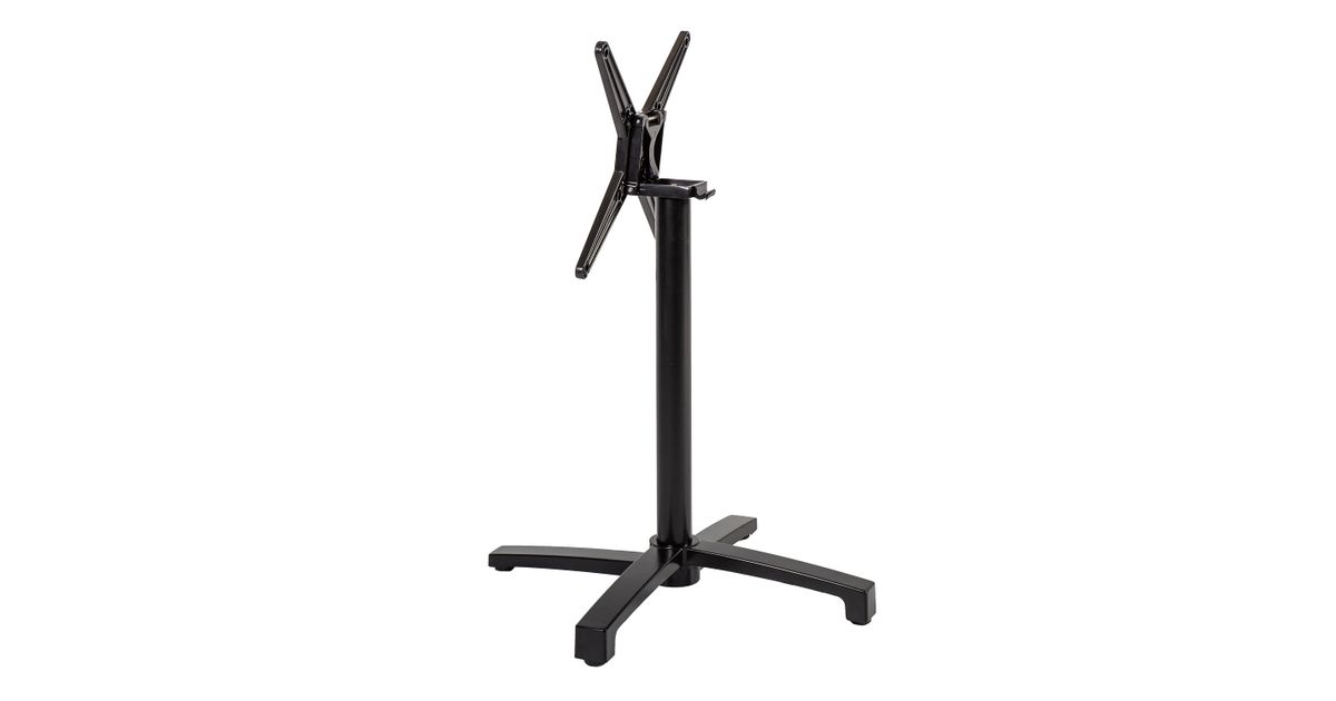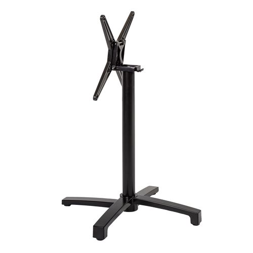 Table leg BISTRO 69x69xH72cm, black. The table leg is made of aluminum and finished with black powder coating. Dimensions of the support cross are 52x52cm. The table top support cross can be tilted to the side. The dimensions of the base are 69x69cm, center pole D60x1,5mm. The maximum dimensions of a suitable tabletop are 90x90cm. Table top mounting screws are not included. The product is weatherproof.