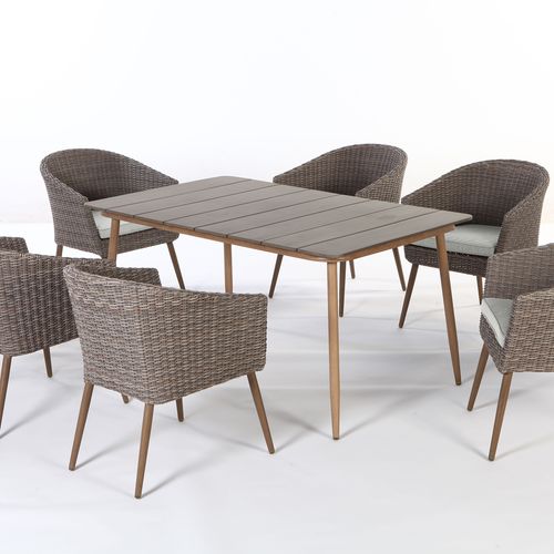 Table NORWAY 147x90xH73cm beige. The aluminum frame of the dining table is powder coated. The legs of the table are cone shaped and brush painted. The dimensions of the table are 147x90xH73cm.