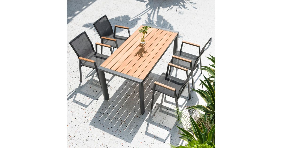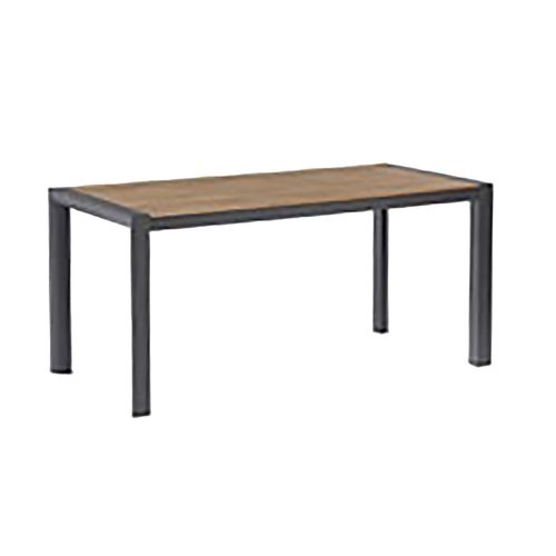 Table TAMPERE 160x80xH75cm, teak. The table top is made of natural teak wood slats. The table frame is made of dark grey powder coated aluminium. The aluminium tube dimensions are 70x70x1,5mm. The dimensions of the product are 160x80xH75cm.