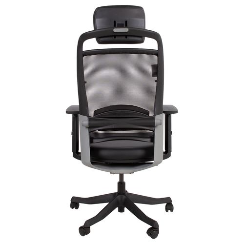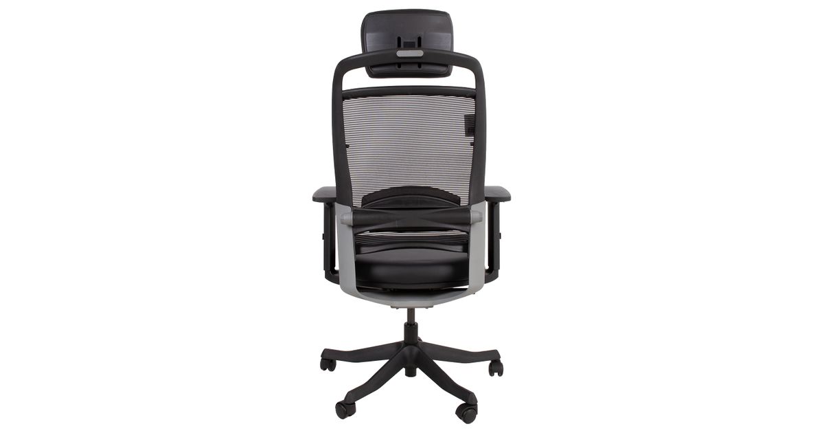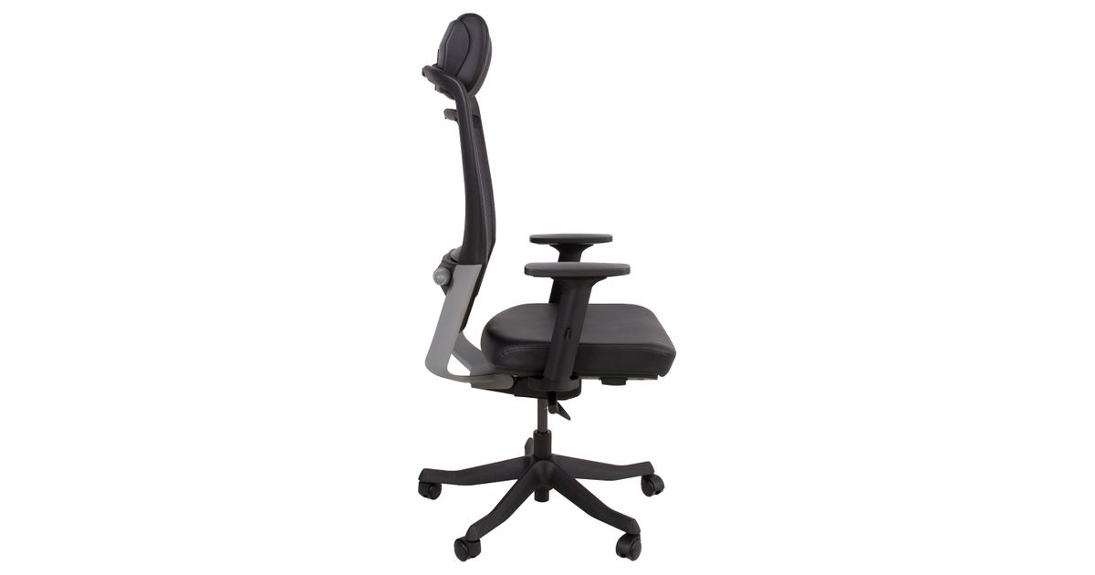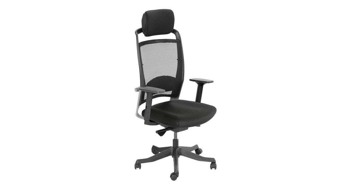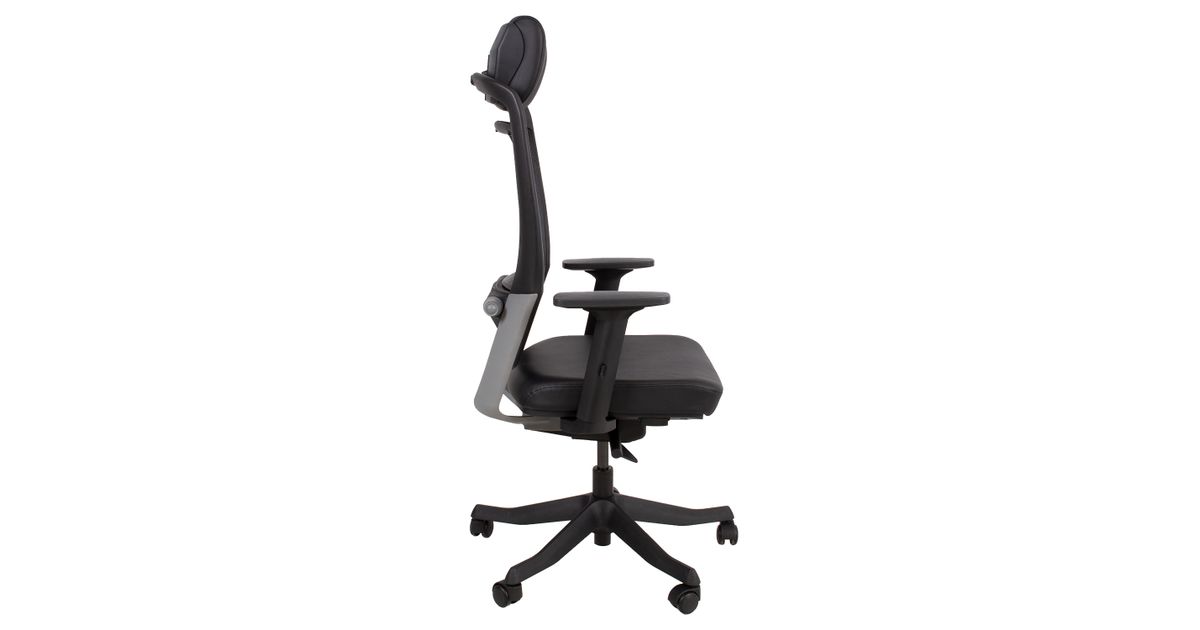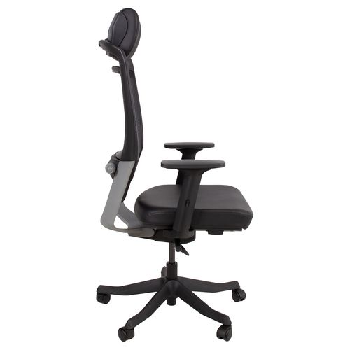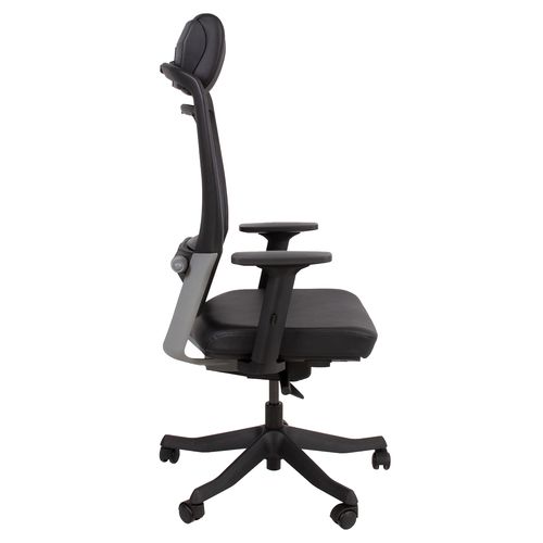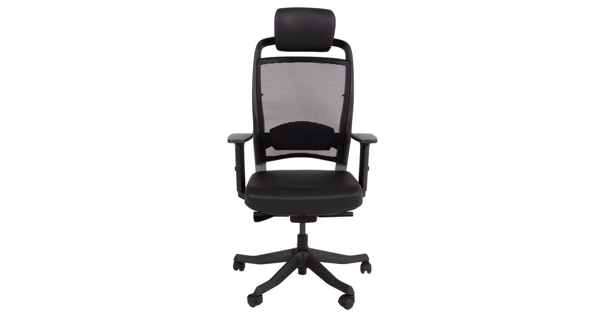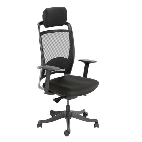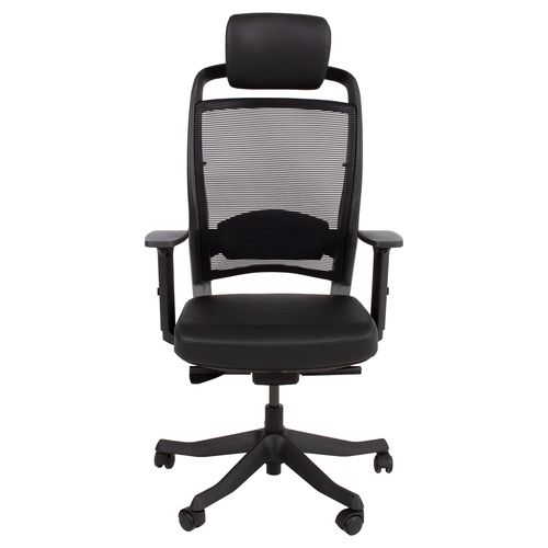 Task chair FULKRUM black/leather. The seat is covered with leather. The backrest is covered with polyester mesh fabric which ensures good ventilation. Frame color: black and silver. The auto tilt-tension synchronized mechanism self-adjusts recline force to user’s weight. Adjustable lumbar support. Pneumatic seat height adjustment. The black armrests are made of plastic, the depth and angle are adjustable. The height of the armrests is adjustable 20-30cm. Adjustable head rest height. Black 5-prong plastic base, D70cm. The chair has plastic castors, 50mm. Height 114-129cm, seat height 41-57cm, seat depth 41-48cm, seat width 48cm. The dimensions of the product are 62x70xH114-129cm. The weight capacity is 120kg.
