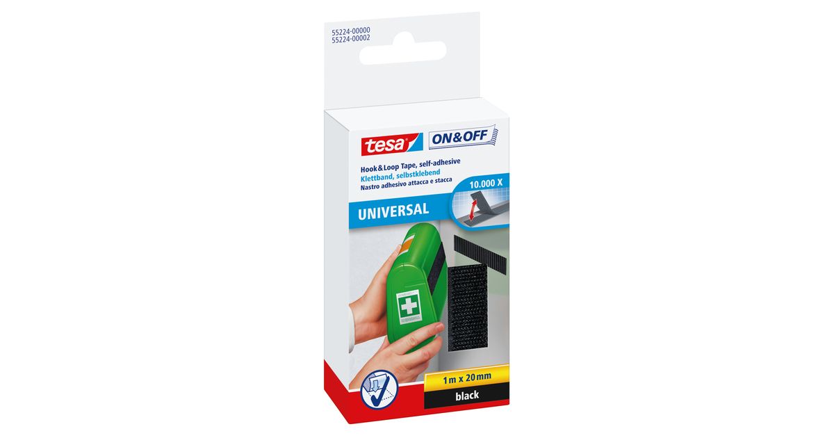 tesa® On & Off General Purpose Stick-on Tape is a versatile hook & loop tape that you will quickly appreciate as practical home and office organizer. It can be used to attach any lightweight object to a wall or any other flat surface while leaving you with the option to remove and reattach it as often as you like. Use it to attach a first aid kit to the wall or keep any kitchen utensils on display for easy reach.