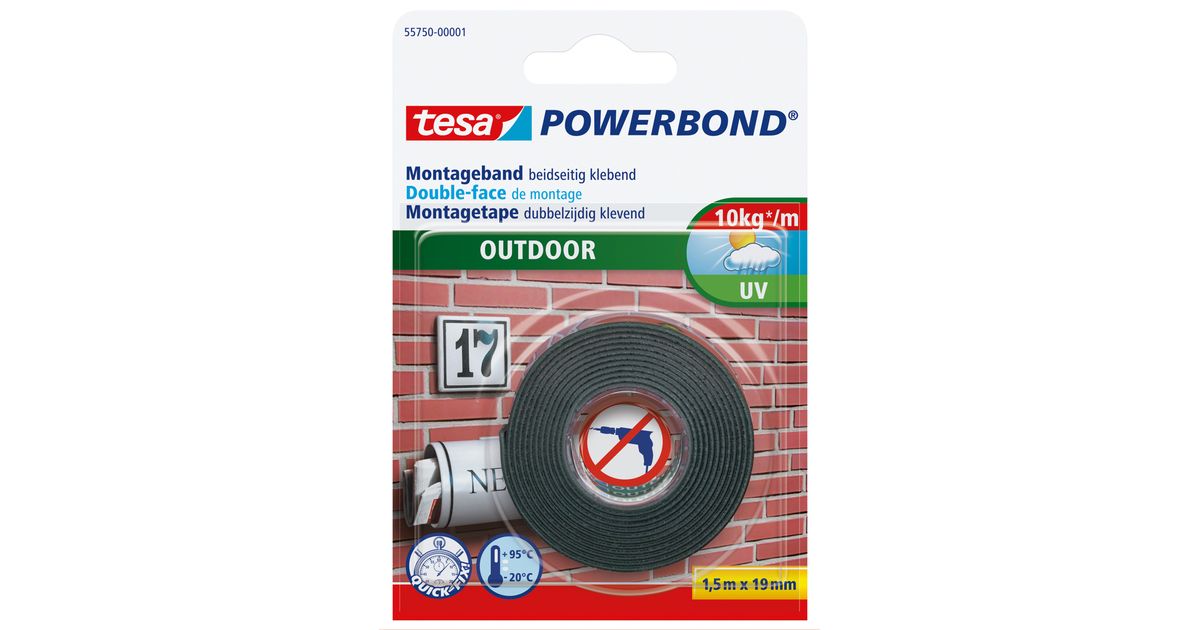 tesa Powerbond OUTDOOR is a double-sided tape to fix things like house numbers on solid surfaces, including outdoors. Easy to use and no tools are required except a pair of scissors. A permanent, strong hold that under optimum conditions means a single 10 cm strip of tape can hold up to 1 kg.