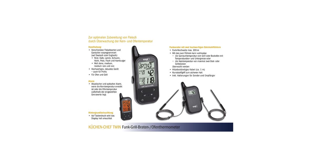 Cook like a pro with 100% success guaranteed. The special feature: the "KITCHEN CHEF TWIN" has two stainless steel sensor probes. This allows you to monitor the temperature of the barbecue’s cooking chamber and BBQ meat or the upper and lower temperature limits in the kitchen oven. You can also monitor the core temperature of max. two pieces of roasts or two pieces BBQ meat simultaneously. And you don’t even have to be in the kitchen – the measured values are send wirelessly from the transmiter to the main unit. So you can make good use of the time to welcome your guests, relax and have a drink – as long as the roast is still in the oven or lying on the barbecue grill. You will be notified by a beep when the desired core temperature is reached, or the oven temperature is not within the programmed limits.