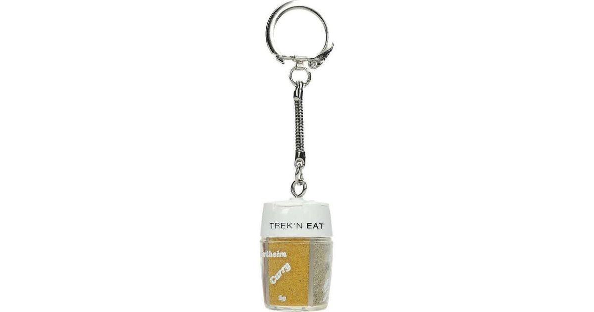 This seasoning dispenser can easily be attached to the belt or key ring. Filled with 4 spices: pepper, salt, curry, sweet pepper.