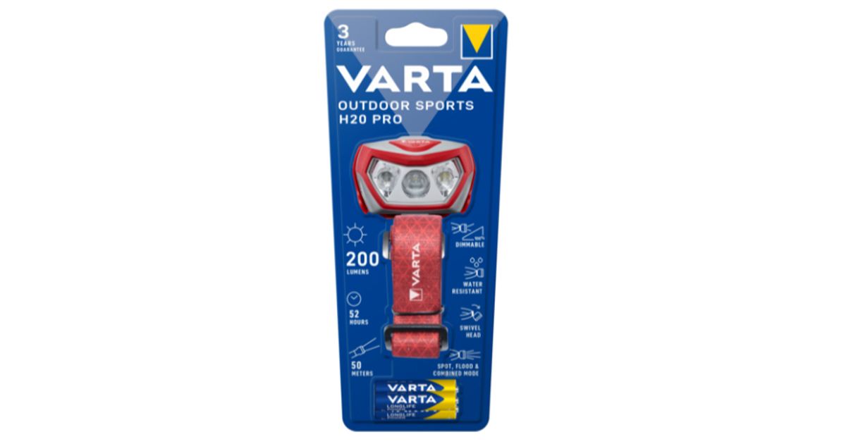 Varta Outdoor Sports H20 Pro, Headband flashlight, Grey, Red, Acrylonitrile butadiene styrene (ABS), Polycarbonate (PC), Buttons, IPX4, LED