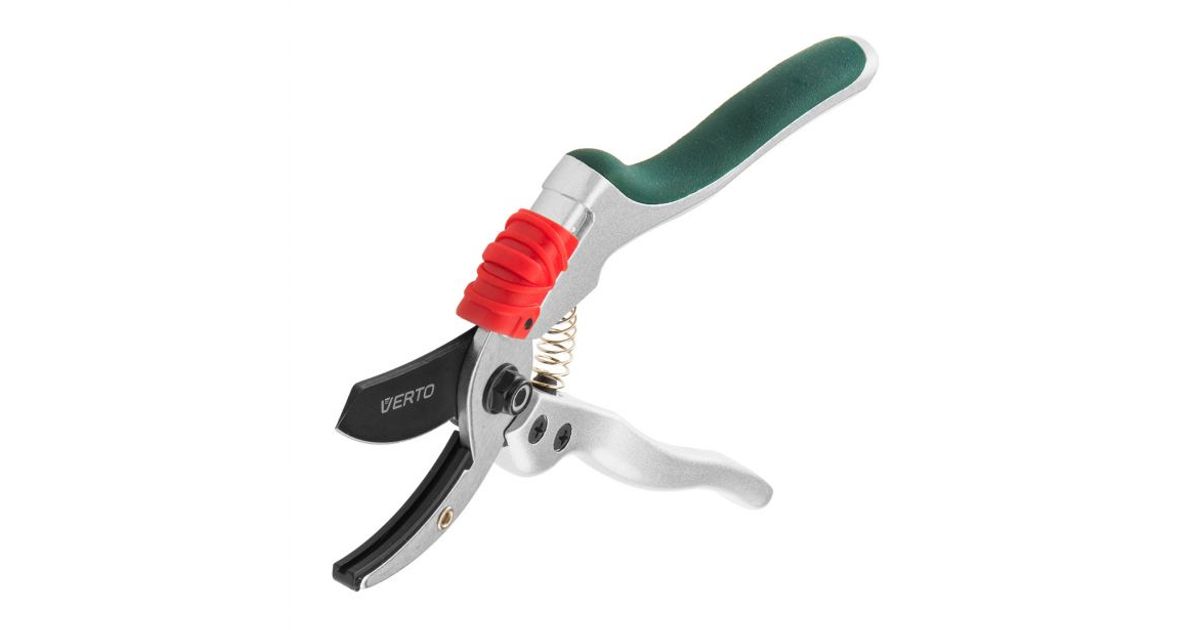 VERTO garden anvil pruning shears made of aluminium (ref. no. 15G207) with 195 mm length and cutting diameter up to 18 mm. Designed to cut branches and bushes. Ergonomic blades offset by 15° greatly improves comfort of work and makes it easier. The blade is teflon coated for corrosion protection. Aluminium body guarantees tool durability. Blade lock prevents from accidental opening. Ergonomic plastic handle is coated with anti slip material and provides safety and comfort when working.