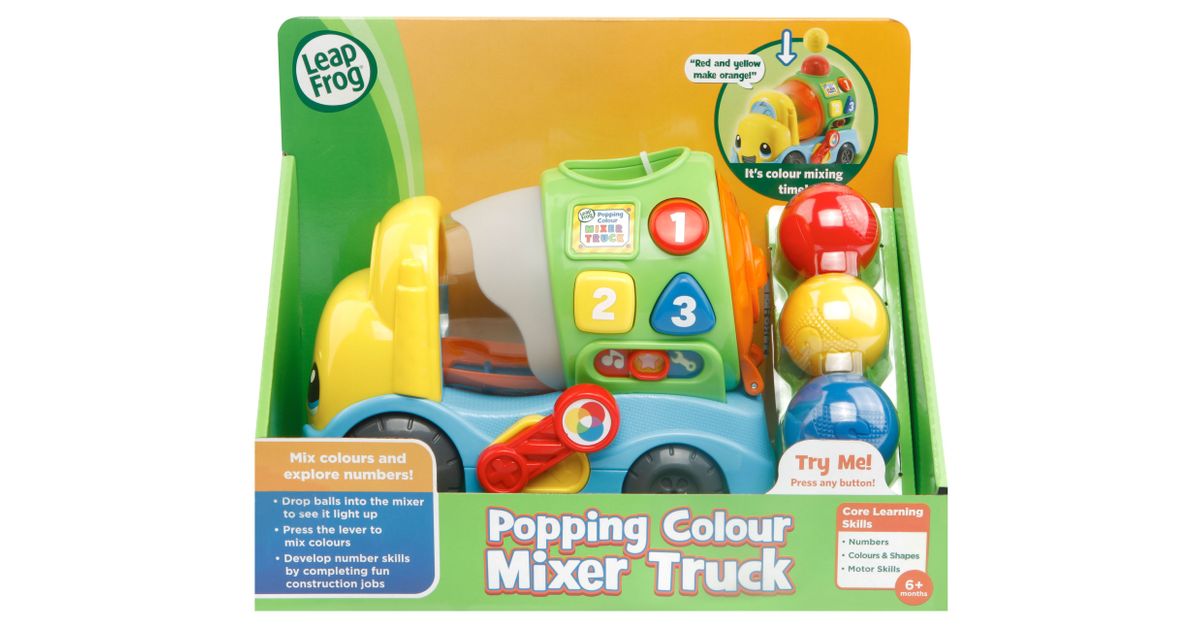 Popping Colour Mixer Truck - a fun and educational toy that is perfect for children who love construction vehicles and colours! This adorable construction truck lights up when a ball is dropped inside, and children can watch as the mixer changes colour. With two balls added to the colour mixer and the lever pushed, children can learn how to create a whole new colour. The Popping Colour Mixer Truck is designed to teach children about colours, shapes, and numbers, with colourful shape buttons on the truck that can be pressed to answer questions or add sounds to the music. Children can drop the balls inside and take them out by opening the back door, while all the balls easily store inside when playtime is over. This toy is perfect for children who love to learn through play, with its fun learning phrases and cool construction sounds that add to the excitement.