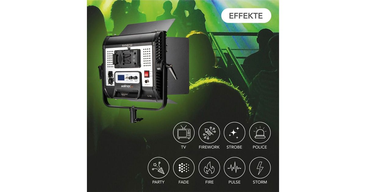 - Effect generator with different lighting situations for film shoots or events. The colour change can also be triggered via microphone or music from a smartphone, ideal for parties.
