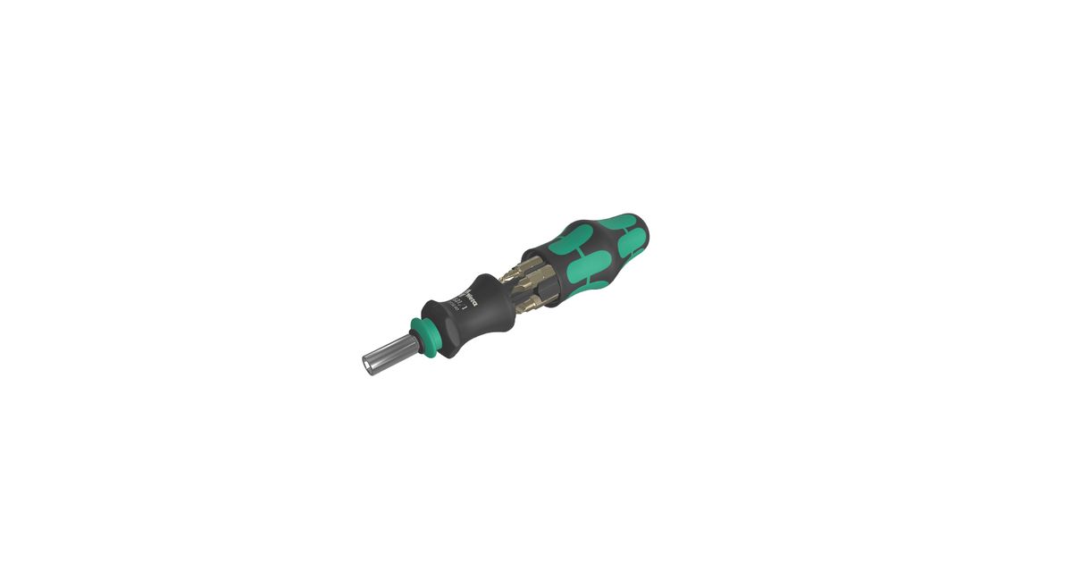 Wera compact tool with multi-component Kraftform handle for high working speeds and particularly ergonomic screwdriving. Integrated bit magazine in the handle for the storage of 6 bits.