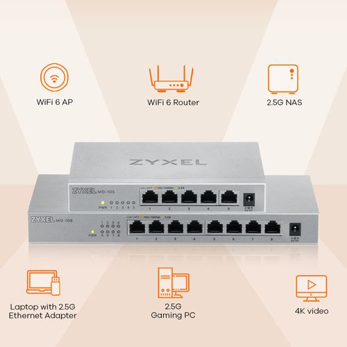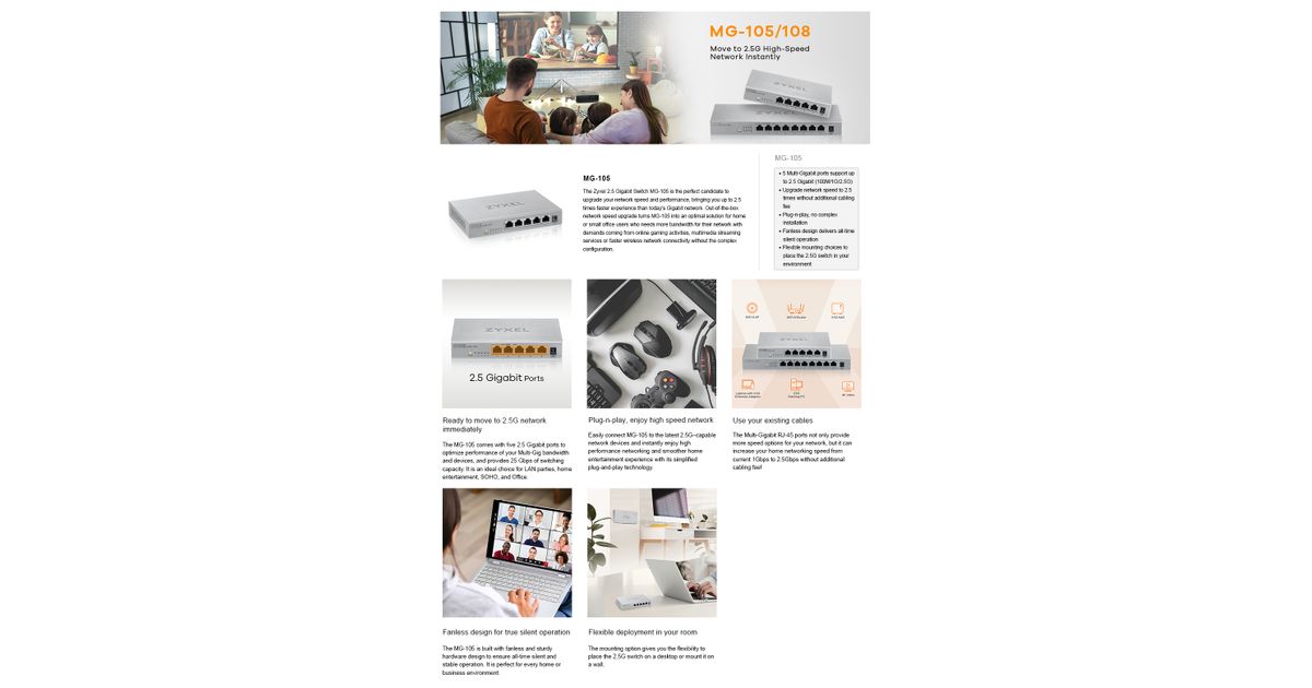 Easily connect MG-105 or MG-108 to the latest 2.5G-capable network devices such as 2.5G NAS, 2.5G PCIe adapter, gaming console, VR gaming, WiFi 6 AP, 4K video, desktop, and more and more to instantly enjoy high performance networking and smoother home entertainment experience with its simplified plug-and-play technology.