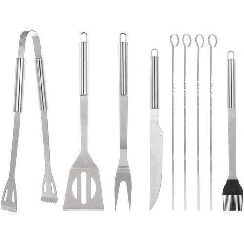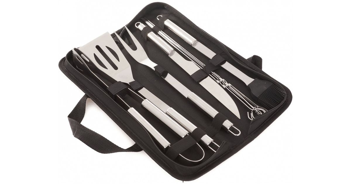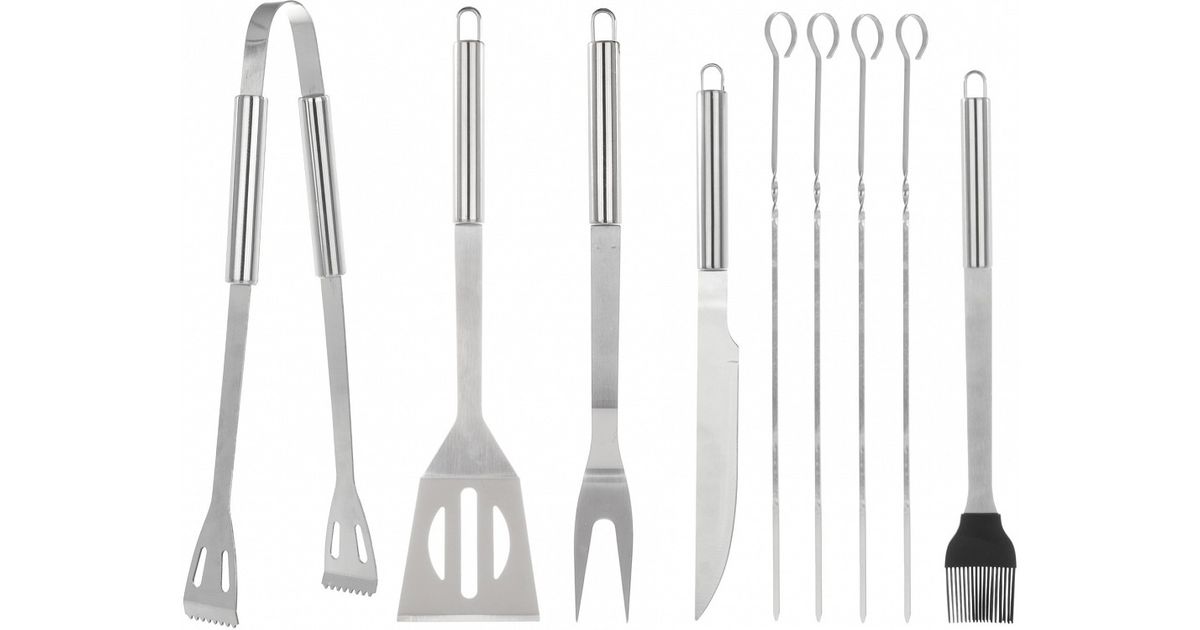 Tugevast roostevabast terasest valmistatud grilltarvikute komplekt. Komplektis 9 grillitarvikut (nuga. kahvel. spaatel. tangid. pintsel ja neli grillvarrast. Mugav kandesangaga kott. Mõõdud 38.5x12x5 cm.