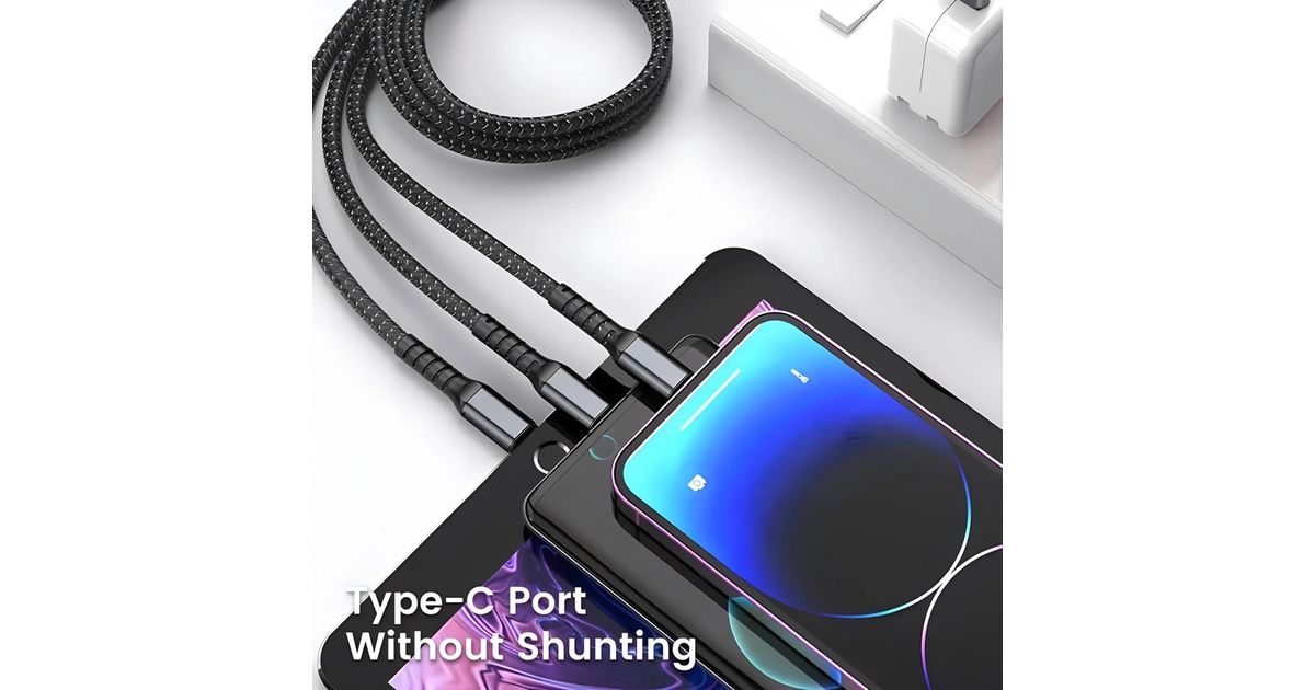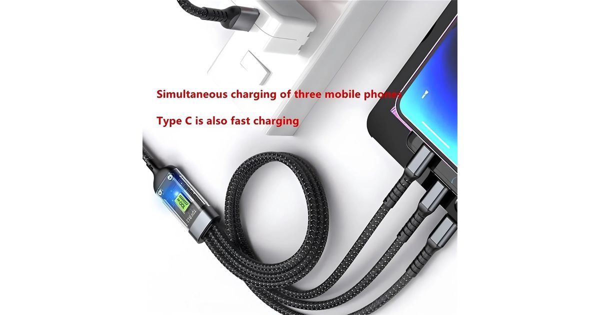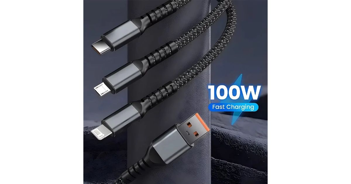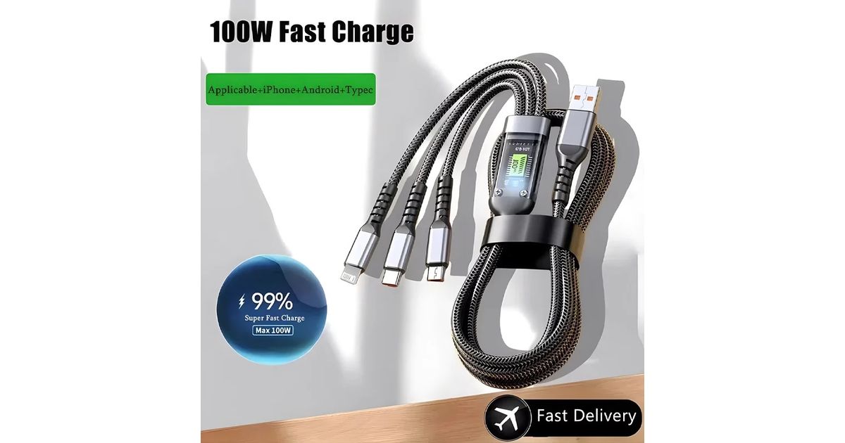 100 W 3-in-1 läbipaistev, ülikiire laadimiskaabel 6 A, universaalne, USB-C, Micro-USB ja Lightning