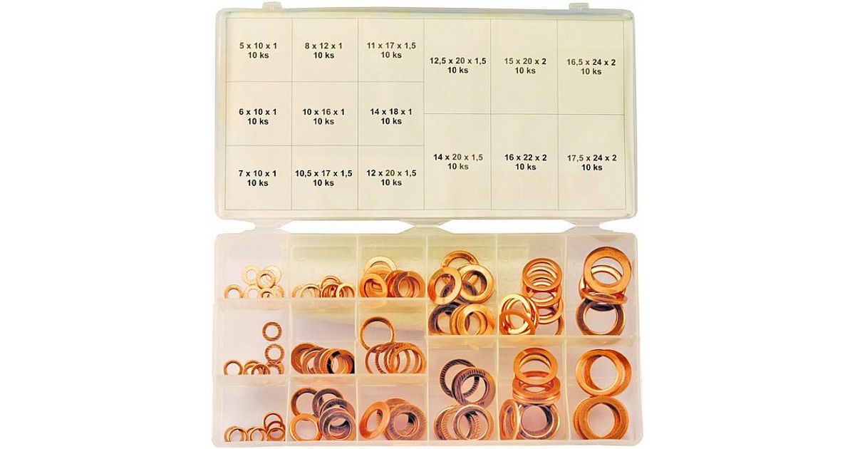 15 erinevat mõõtu. kõiki mõõte 10 tk. Plastkarbis. Vaskseibid: 5x10x1 - 6x10x1 - 7x10x1 - 8x12x1 - 10x16x1 - 10.5x17x1.5 - 11x17x1.5 - 12x10x1.5 - 12.5x20x1.5 - 14x18x1 - 14x20x1.5 - 15x20x2 - 16x22x2 - 16.5x24x2 - 17.5x24x2 mm.
