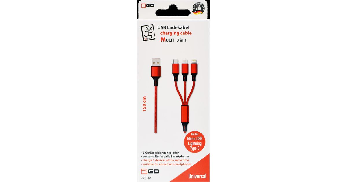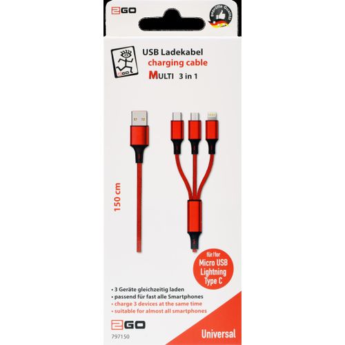 2GO 797150, 1,5 m, USB B, USB C/Micro-USB B/Lightning, Punane
