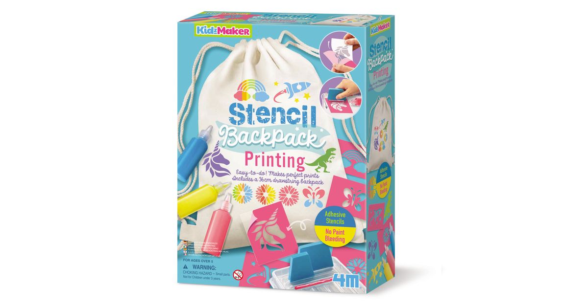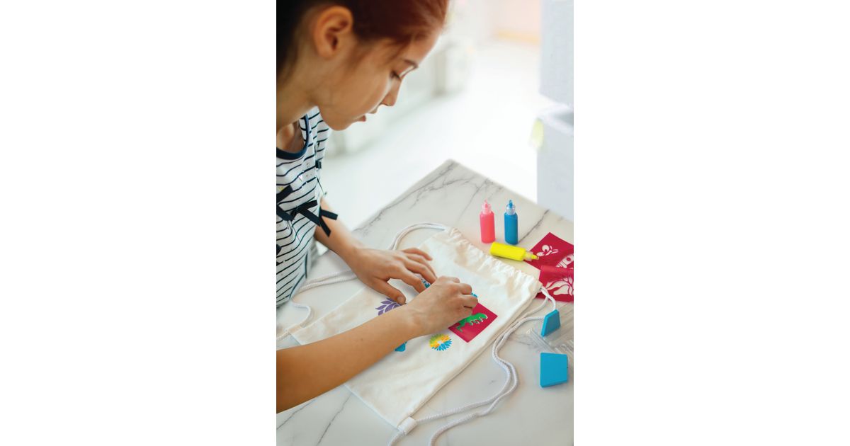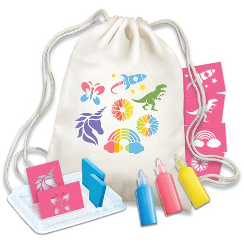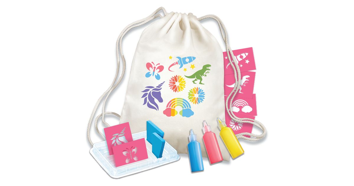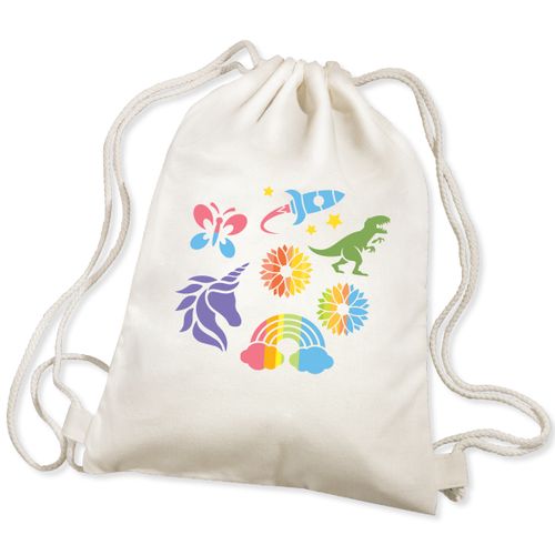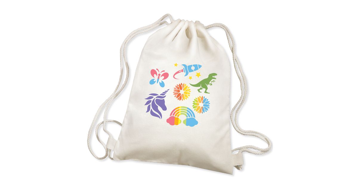 See on lihtne! Teeb täiuslikke printe. Kaasas 36 cm pingutusnööriga seljakott. Teie laps saab kasutada šabloone oma seljakoti kaunistamiseks kaunite printide tegemiseks. Kaasasolevate kangavärvidega saavad nad ka seljakoti oma lemmikvärvidega värvida.