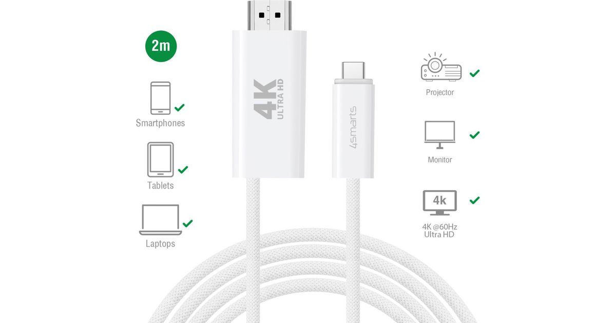 4smarts 540957. Kabellänge: 2 m, Anschluss 1: USB C, Steckverbinder 1 Geschlecht: Männlich, Anschluss 2: HDMI Typ A (Standard), Steckverbinder 2 Geschlecht: Männlich/Weiblich, Prod