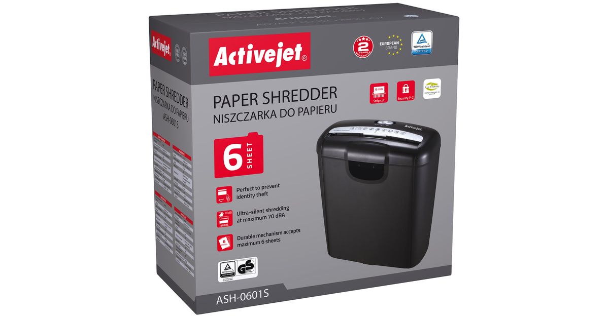 Activejet ASH-0601S paper shredder, Riba tüüpi purustaja, 22 cm, 10 l, Nööbid, 3000 mm/min, P-1