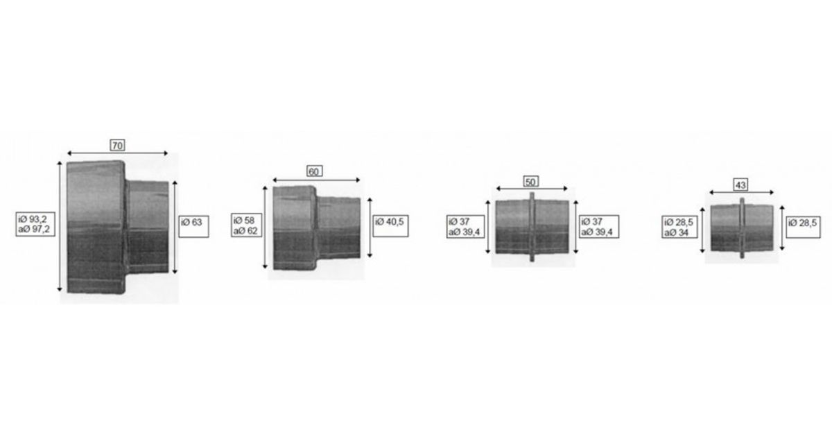 4 kahandusadapterit, et ühendada masinad tolmuäralduse välismõõduga 63 / 46 / 40 / 36 mm ja sisemõõduga 62 / 57 / 39 / 27 mm.