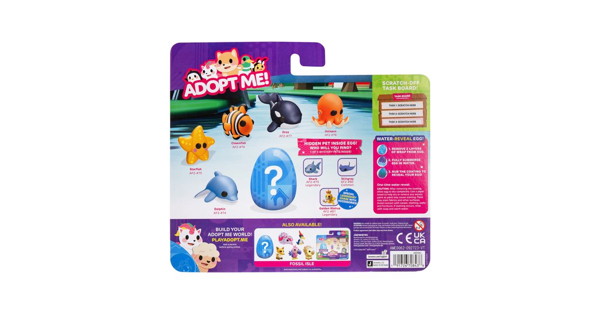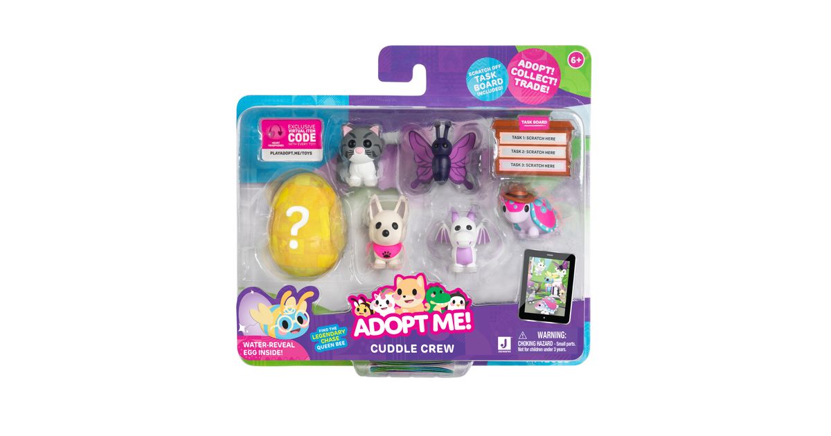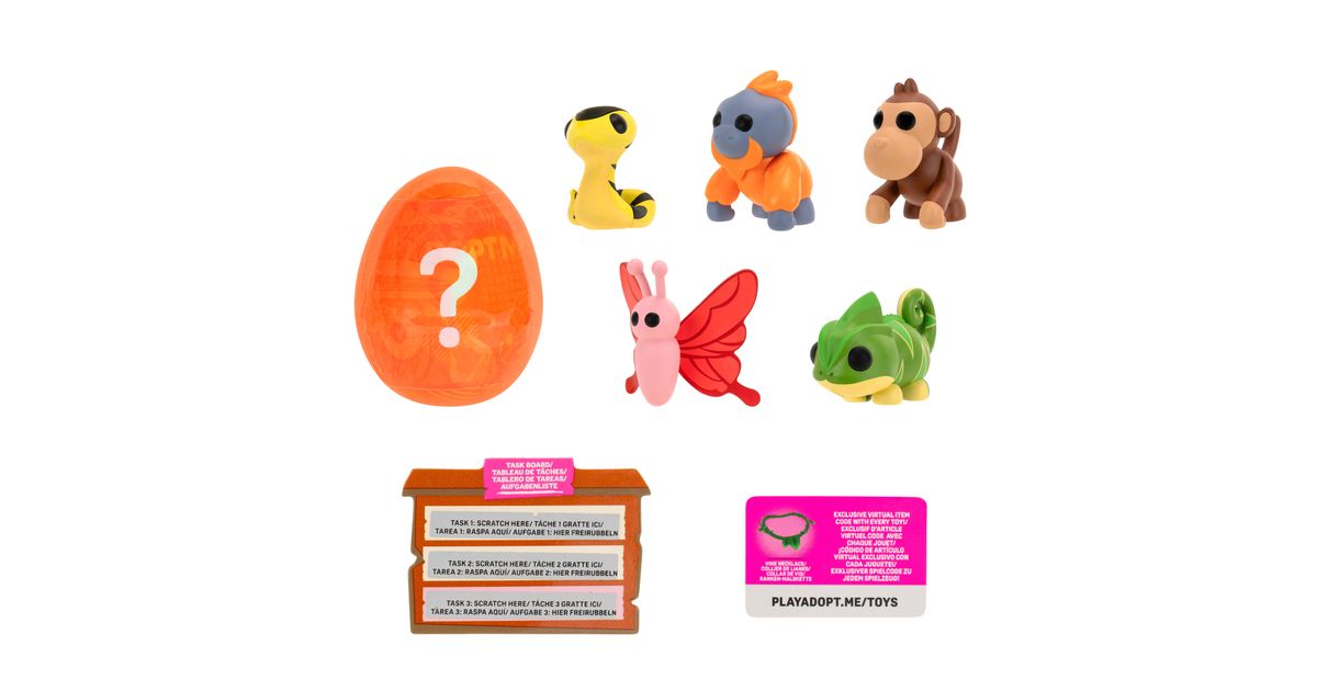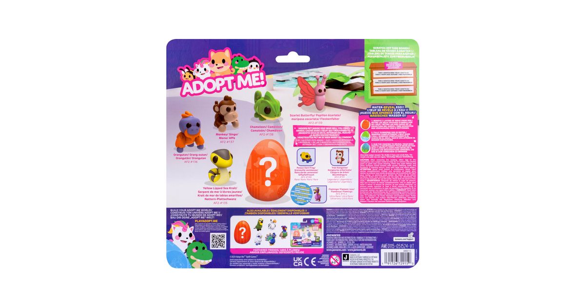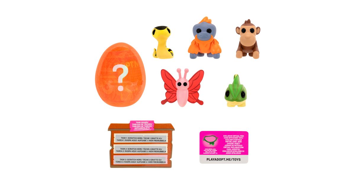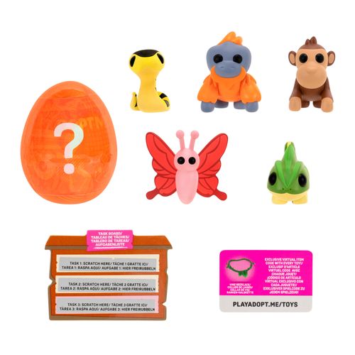 Kogege rõõmu väga ihaldatud lemmikloomade omamisest online-mängust Adopt Me! Mitmikpakiga saad 5 erinevat tegelast ja ühe üllatuslooma, keda armastada ja kelle eest hoolitseda. Temaatilisest munast leiad ühe kolmest 5 cm suurusest plastikust salapärasest lemmikloomast. Boonusena sisaldab multipakk ühte eksklusiivset virtuaalset esemekoodi. Need kollektsioneeritavad esemed sobivad ideaalselt nii mängimiseks kui ka näitamiseks!