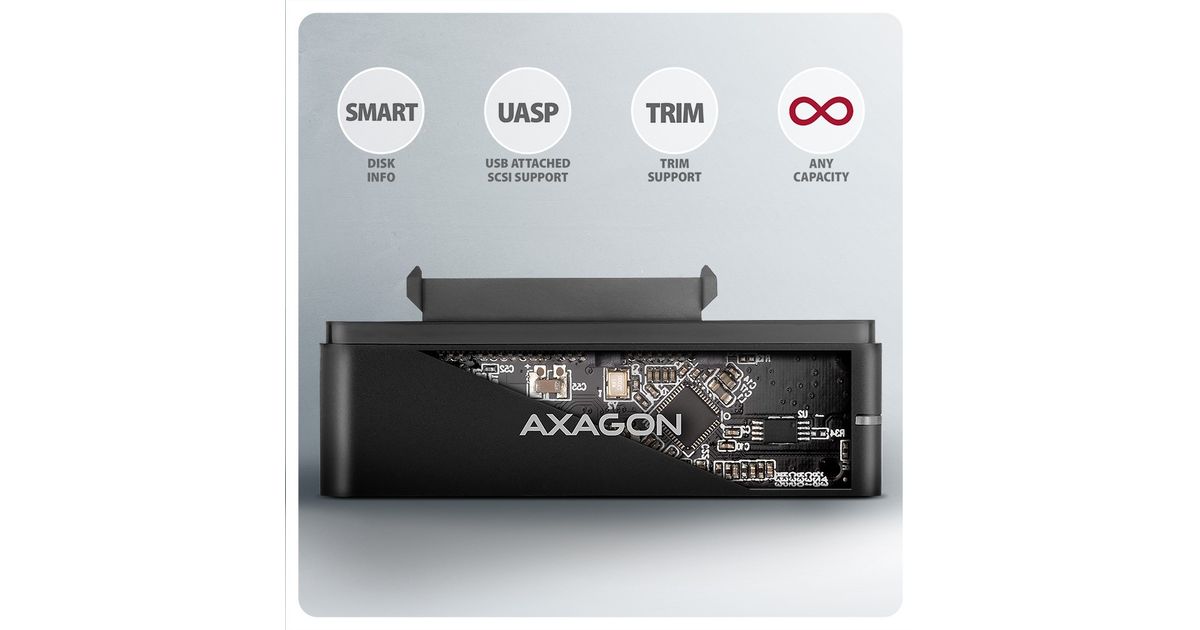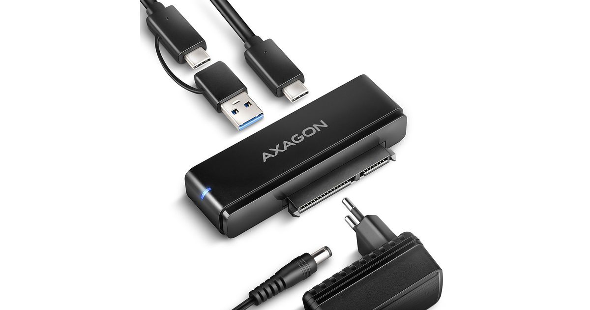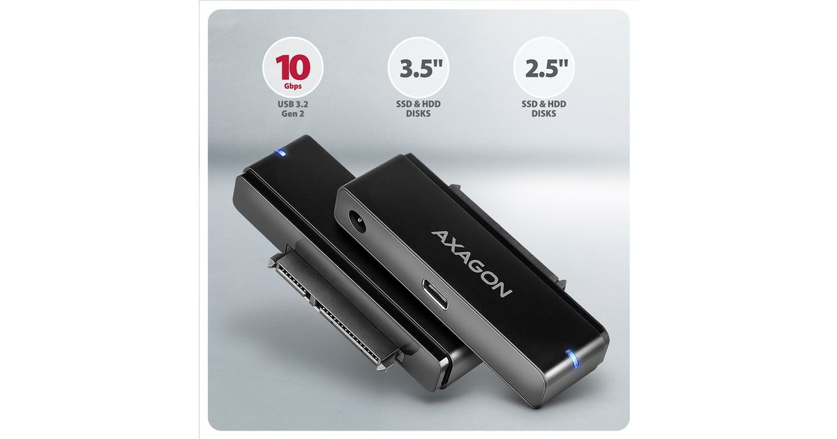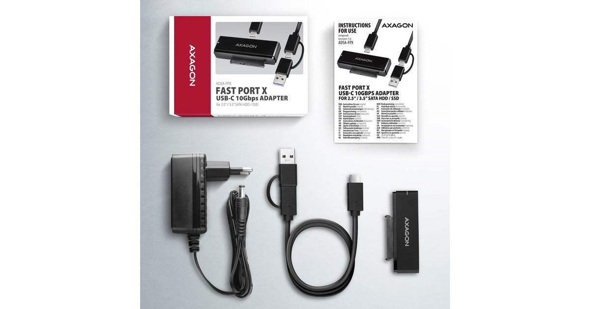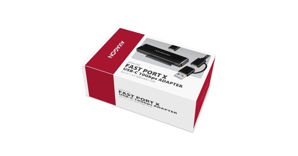 The AXAGON ADSA-FPX FAST PORT X universal adapter with USB-C 10Gbps and SATA 6G interface is designed to easily connect a 2.5" / 3.5" SATA hard drive or SSD to your computer. Thanks to the fast USB 3.2 Gen 2 interface with the transmission rate of up to 10 Gb/s, the speed of 2.5" SSDs is not limited and is approximately 20% faster than USB 3.2 Gen 1 (USB 3.0) adapters or boxes.