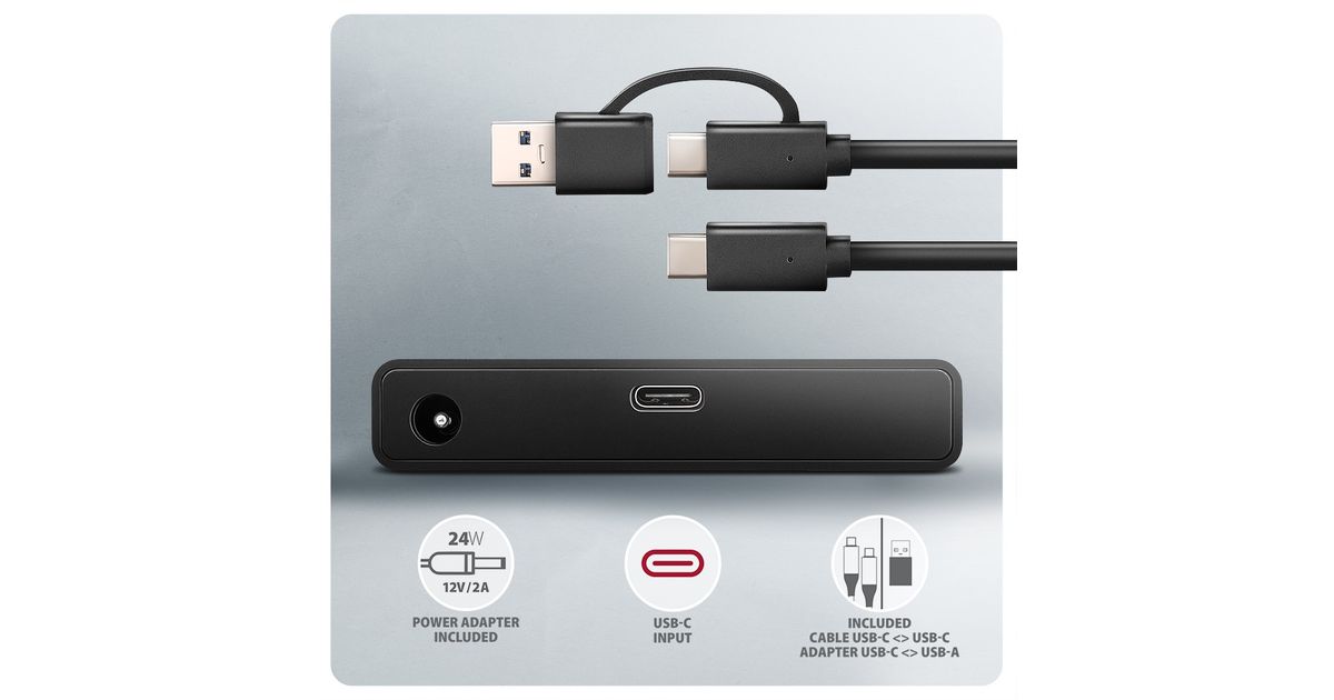 In the package you will find a USB-C USB-C cable 60 cm with a fixed USB-C -> USB-A reduction. This solution enhances the versatility of the adapter, so you can connect it to any USB port on your computer, whether it's a double-sided USB-C connector or a traditional USB-A connector. Also included is a 12V/2A (24W) power adapter for powering 3.5" hard drives. The adapter with a 2.5" SSD/HDD just needs to be powered over the USB bus, so there is no need to manipulate the AC adapter.