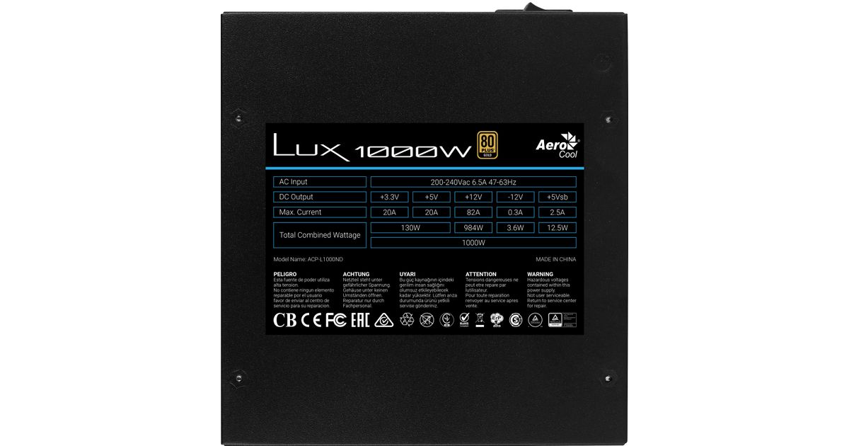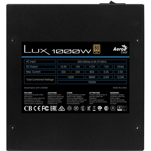 Aerocool LUX, 1000 W, 200 - 240 V, 47 - 63 Hz, 6.5 A, 130 W, 984 W