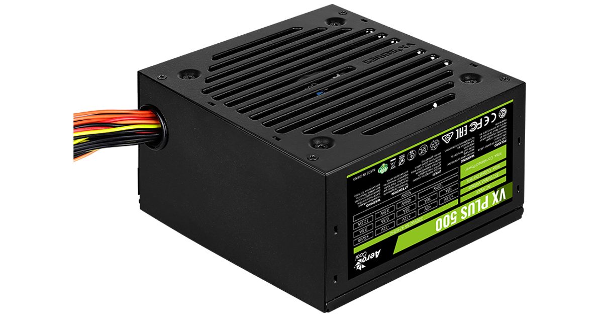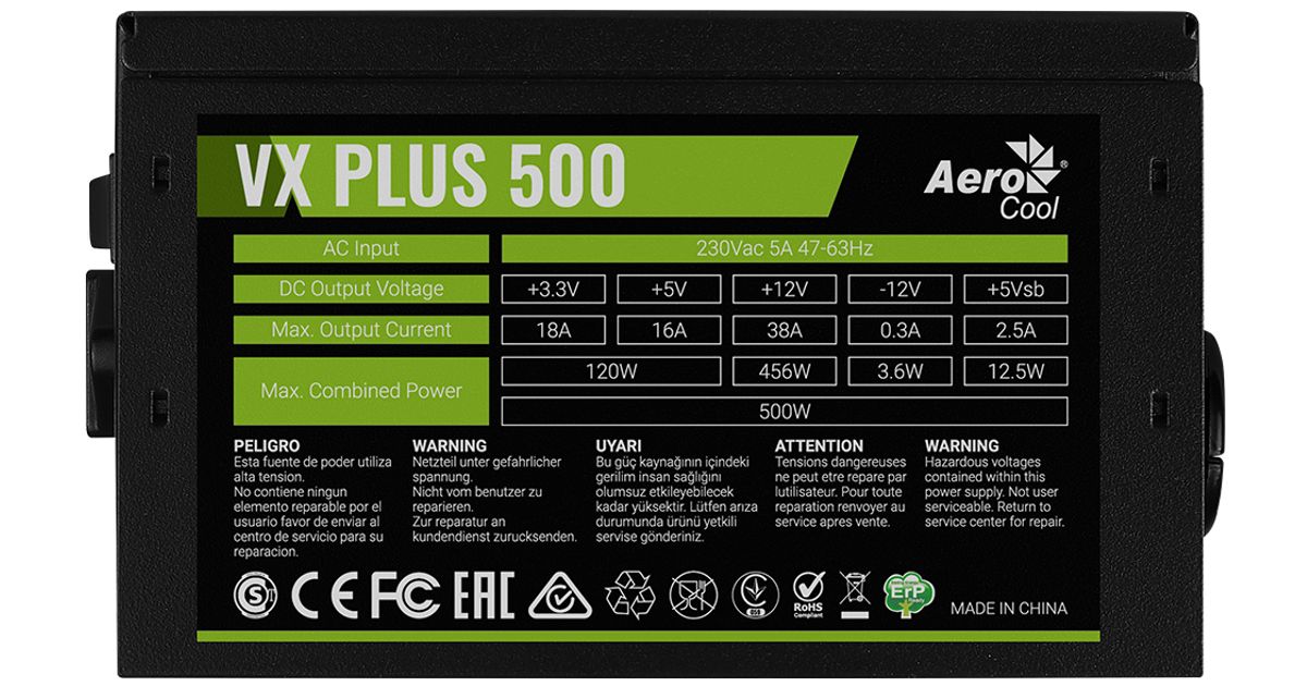 Aerocool VX Plus 500, 500 W, 230 V, 47 - 63 Hz, 4 A, 120 W, 456 W