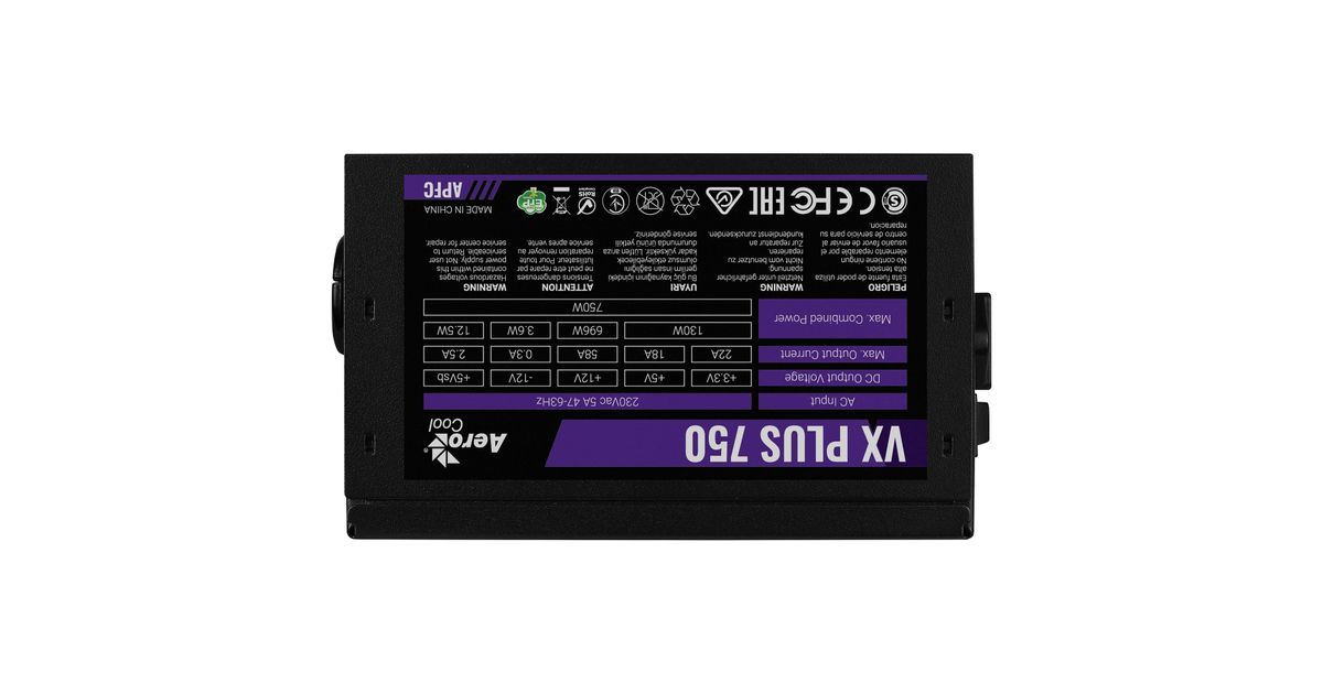 Aerocool VX PLUS 750, 750 W, 230 V, 47 - 63 Hz, 5 A, 130 W, 696 W