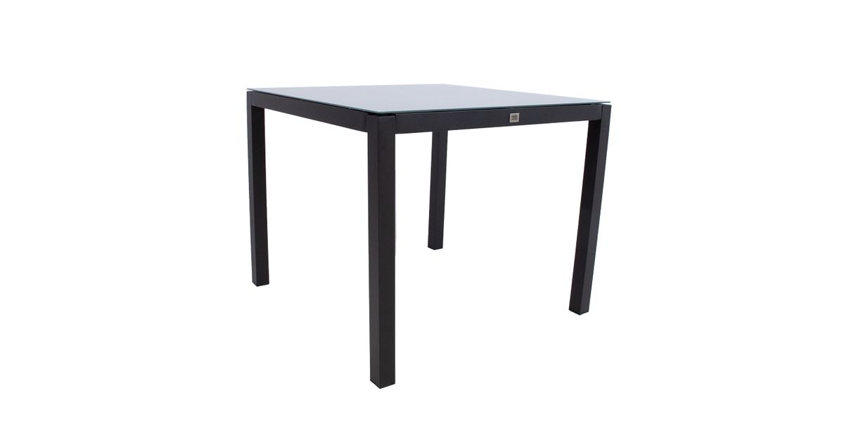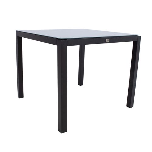 Laud 90x90x74cm. Lauaplaat: 5mm karastatud klaas. Alumiiniumist raam ja jalad viimistletud halli pulbervärviga. Tool 58x65xH90cm, hall textiline iste. Tooli raam on valmistatud alumiiniumist ja viimistletud halli pulbervärviga. Kaalupiirang 120kg.