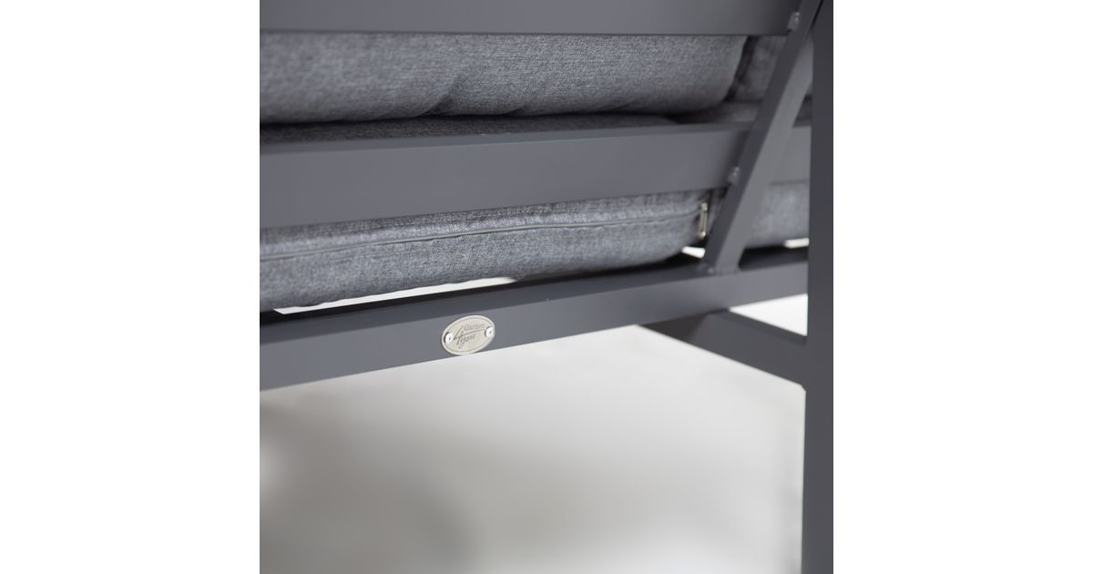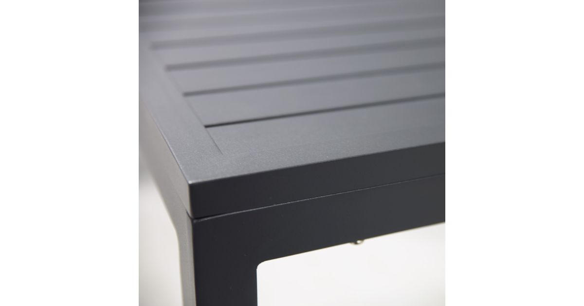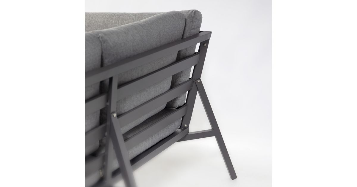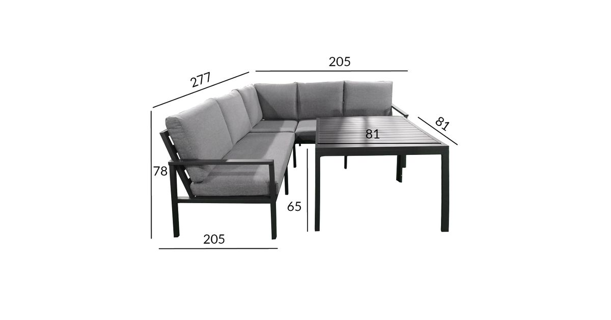 Laud 81x81xH65cm. Nurgadiivan 204x204xS80xH78cm. Diivaniraam, lauplaat ja -jalad on valmistatud alumiiniumist ning pulbervärvitud. Padjad kuuluvad komplekti (3 istmepatja + 6 seljatoepatja). Padjakatted: hall polüesterkangas. Istmepatjade paksus 10cm, seljatoepatjade paksus 8cm.