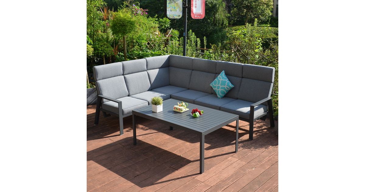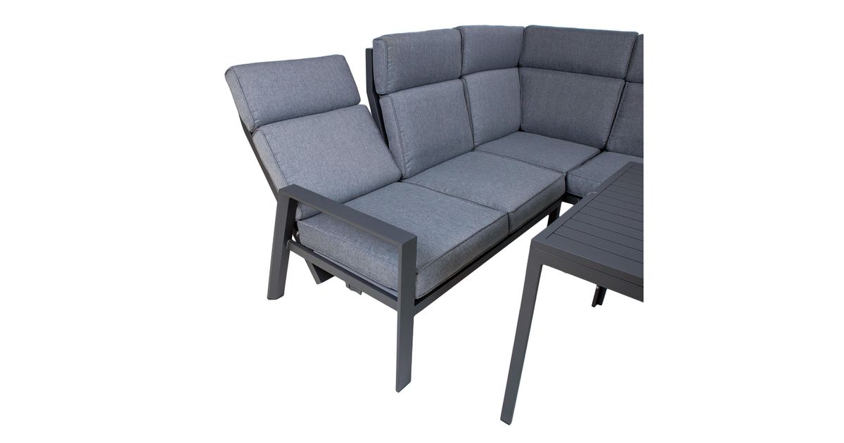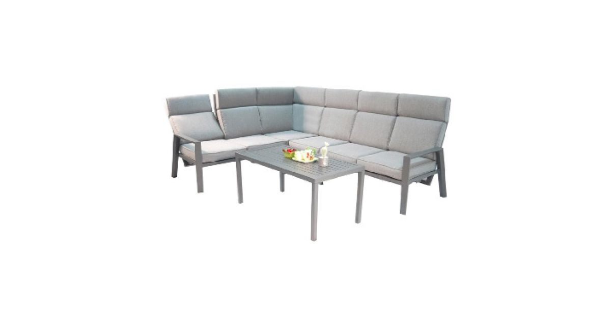 Diivaniraam, lauplaat ja jalad on valmistatud alumiiniumist ning kaetud tumehalli pulbervärviga. Laud 140x87xH67cm. Nurgadiivan koosneb 3-st osast: parema käetoega 2-kohaline osa 127x81xH105cm, vasaku käetoega 2-kohaline osa 127x81xH105cm, nurk 141x81xH105cm. Käetoega istme seljatugi (vasakul ja paremal) on reguleeritav. Komplekti kuulub 6 istmepatja 60x60x10cm ja 7 seljatoepatja 60x65x8cm. Padjakatted: hall polüesterkangas.