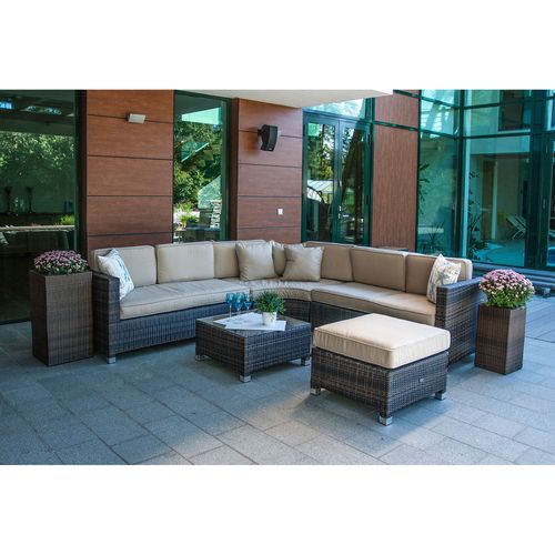 Diivan 255x255xH68cm (nurgamoodul 110x110xH68cm, parem ja vasak moodul 145x75xH68cm, istmekõrgus 34+13cm). Laud 66x66xH34cm, lauaplaat: klaas. Tumba 66x66xH34+13cm. Komplekti kuuluvad istme- ja seljatoepadjad + 4 väikest diivanipatja. Toode on ilmastikukindel. Plastikpunutise värvikood: ZF8974.